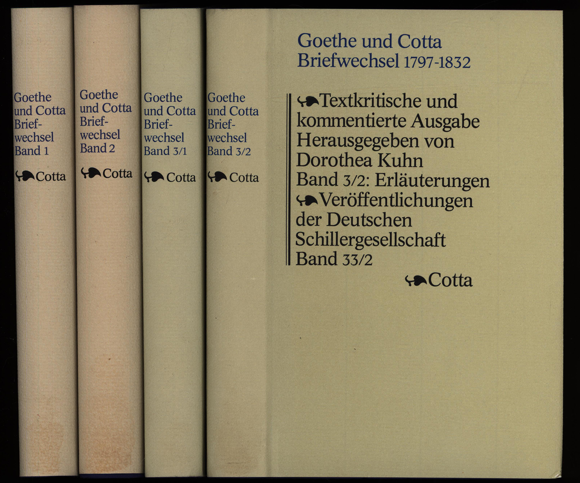 Goethe, Johann Wolfgang von; Kuhn, Dorothea [Hrsg.]: Goethe und Cotta. Briefwechsel 1797-1832. Textkritische und kommentierte Ausgabe in drei Bänden. Band 1: Briefe 1797-1815. Band 2: Briefe 1816-1832. Band 3/1: Erläuterungen zu den Briefen 1797-1815. Band 3/2: Erläuterungen zu den Briefen 1816-1832. Herausgegeben von Dorothea Kuhn. 3 Bände (in 4, komplett). Stuttgart, Cotta, 1979 – 1983. 8°. 22 x 14 cm. 286, 322, 355, 359 Seiten. Original-Leinenbände mit Original-Schutzumschlägen und grauen Kopfschnitten. (= Veröffentlichungen der Deutschen Schillergesellschaft, Bände 31-33/2).