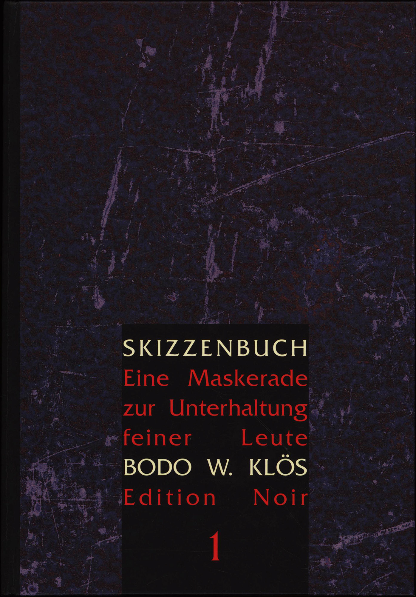 Klös, Bodo W.: Eine Maskerade zur Unterhaltung feiner Leute. [Mit Original-Radierung]. Lich, Galerie & Edition Noir, 1999. Groß-8°. 24 x 16,5 cm. 24 Seiten auf einem Blatt in Leporellofaltung, eingebunden in farbig illustriertem Original-Pappband. (= Skizzenbuch. Nr. 1).