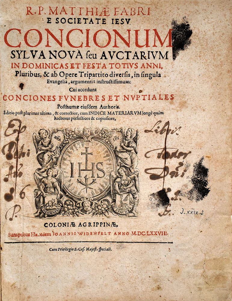 Faber, Matthias: Concionum sylva nova seu auctarium in dominicas et festa totius anni, & ab opere tripartito diversis, in singula Evangelica, argumentis instructissimum: cui accedunt Conciones Funebres et Nuptiales posthumae ejusdem Authoris. Teil 1 und 2 [in 1 Band]. Coloniae Agrippinae, sumptibus haeredum Joannis Widenfelt [Johann Weidenfeld], 1678/1677. 4°. 26 x 21 cm. [4] Blatt, 898 Seiten; [4] Blatt, 452 Seiten, [22] Blatt. Brauner Ganzlederband der Zeit auf 4 Bünden mit blindgeprägtem Titel auf ledernem Rückenschild und rotem Sprengschnitt.