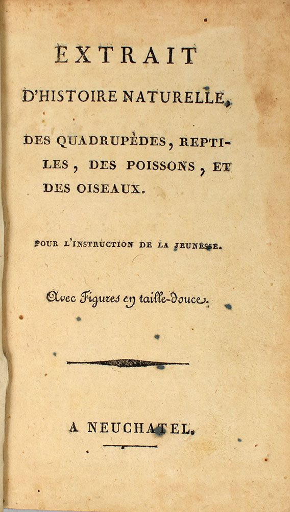 Buffon, Georges Louis Leclerc: Extrait d’Histoire Naturelle, des Quadrupèdes, Reptiles, des Poissons, et des Oiseaux. Pour l’Instruction de la Jeunesse. Neuchatel, [s.n.], [um 1800]. 12°. 14 x 8,5 cm. 160 Seiten. 12 Tafeln. Brauner Lederband der Zeit mit goldgeprägtem Titel auf schwarzem Lederrückenschild, floraler Rückenvergoldung und rotem Sprengschnitt.