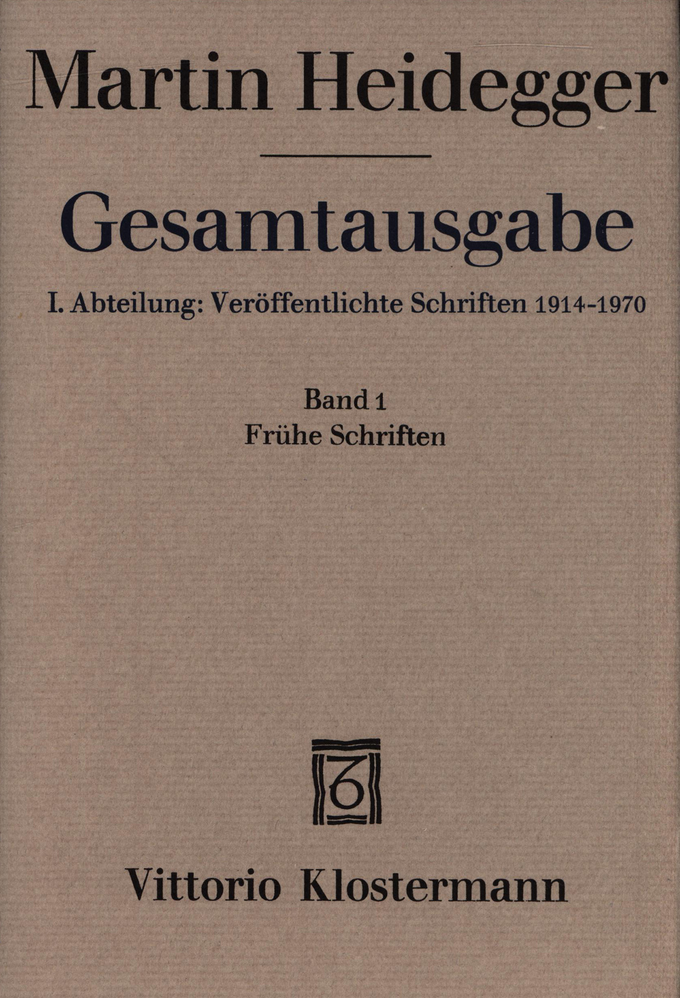 Heidegger, Martin; Herrmann, Friedrich-Wilhelm von [Hrsg.]: Frühe Schriften. Frankfurt am Main, Vittorio Klostermann, 1978. 8°. 21 x 15 cm. XII, 454 Seiten. Original-Leinenband mit Original-Schutzumschlag und grauem Kopfschnitt. (= Martin Heidegger, Gesamtausgabe: I. Abteilung: Veröffentlichte Schriften 1914-1970. Band 1).