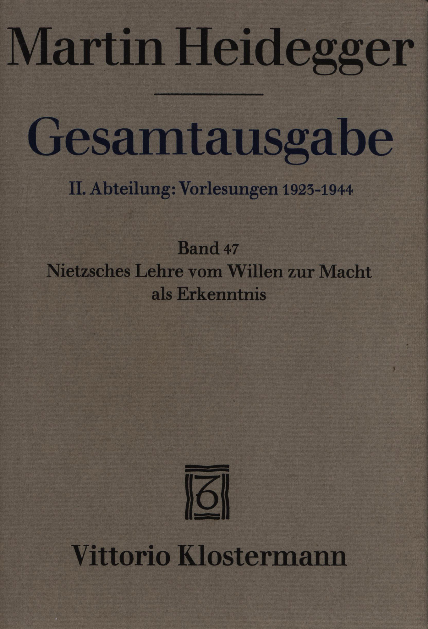 Heidegger, Martin; Hanser, Eberhard [Hrsg.]: Nietzsches Lehre vom Willen zur Macht als Erkenntnis. Frankfurt am Main, Vittorio Klostermann, 1989. 8°. 21 x 15 cm. XV, 330 Seiten. Original-Leinenband mit Original-Schutzumschlag und grauem Kopfschnitt. (= Martin Heidegger: Gesamtausgabe. II. Abteilung: Vorlesungen 1923 – 1944. Band 47).