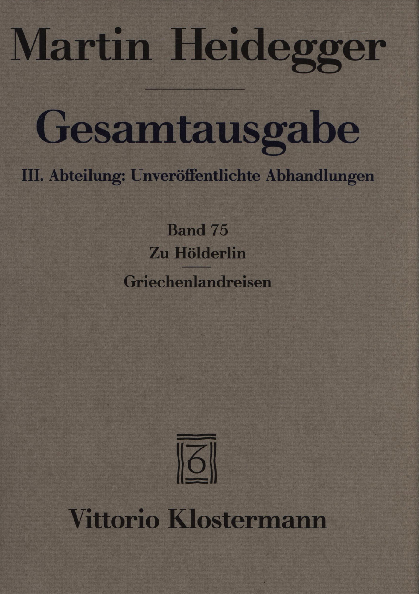 Heidegger, Martin; Ochwadt, Curd [Hrsg.]: Zu Hölderlin. Griechenlandreisen. Frankfurt am Main, Vittorio Klostermann, 2000. 8°. 21 x 15 cm. VI, 407 Seiten. Original-Leinenband mit Original-Schutzumschlag und grauem Kopfschnitt. (= Martin Heidegger, Gesamtausgabe. II. Abteilung: Unveröffentlichte Abhandlungen, Vorträge, Gedachtes. Band 75).