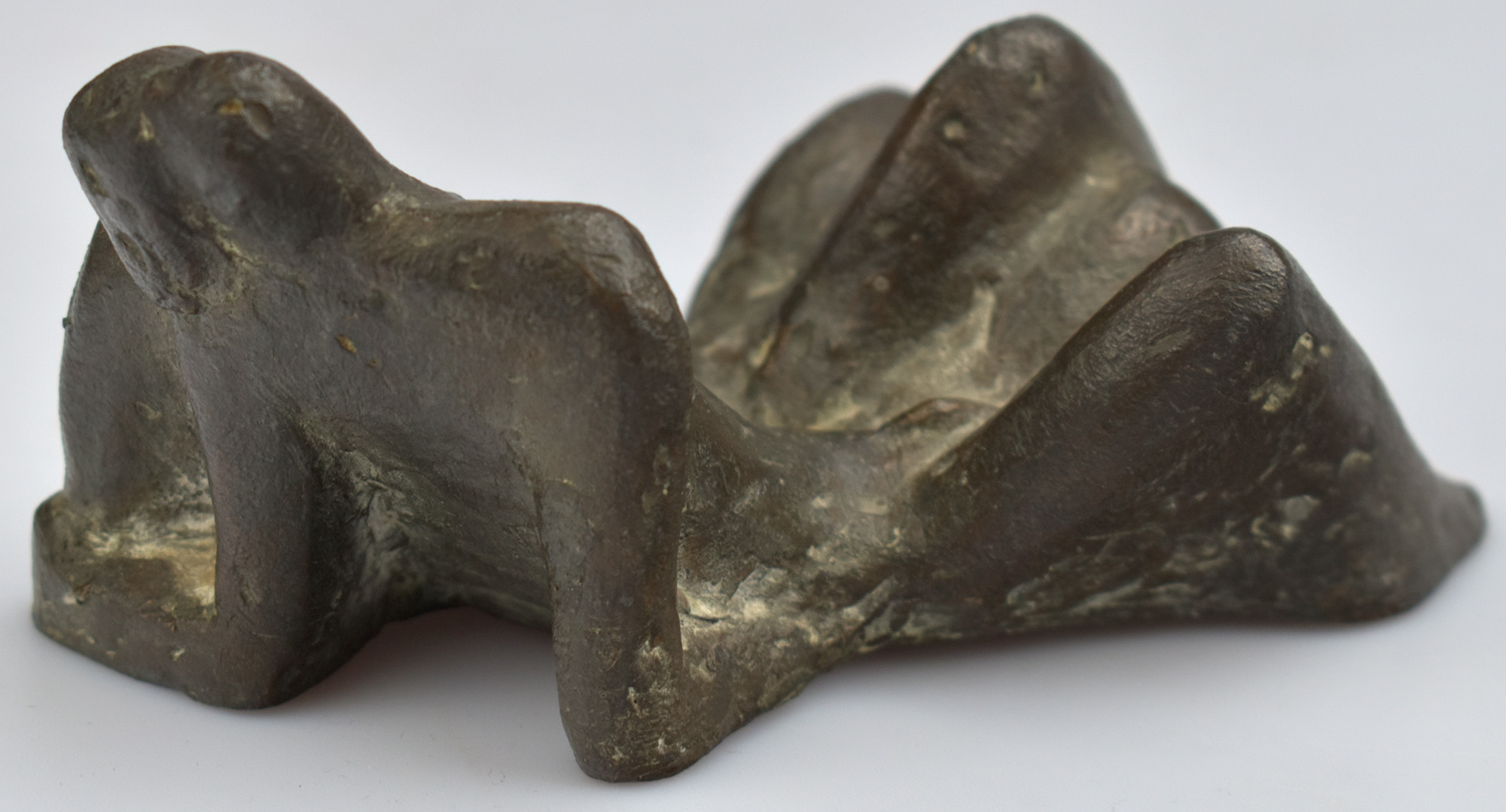 Bronze sculpture with a dark patina. The underside of the bronze piece bears the stamped monogram „GS“. Dimensions: 7 x 14.5 x 9 cm. Weight: 881 g. Very good condition.