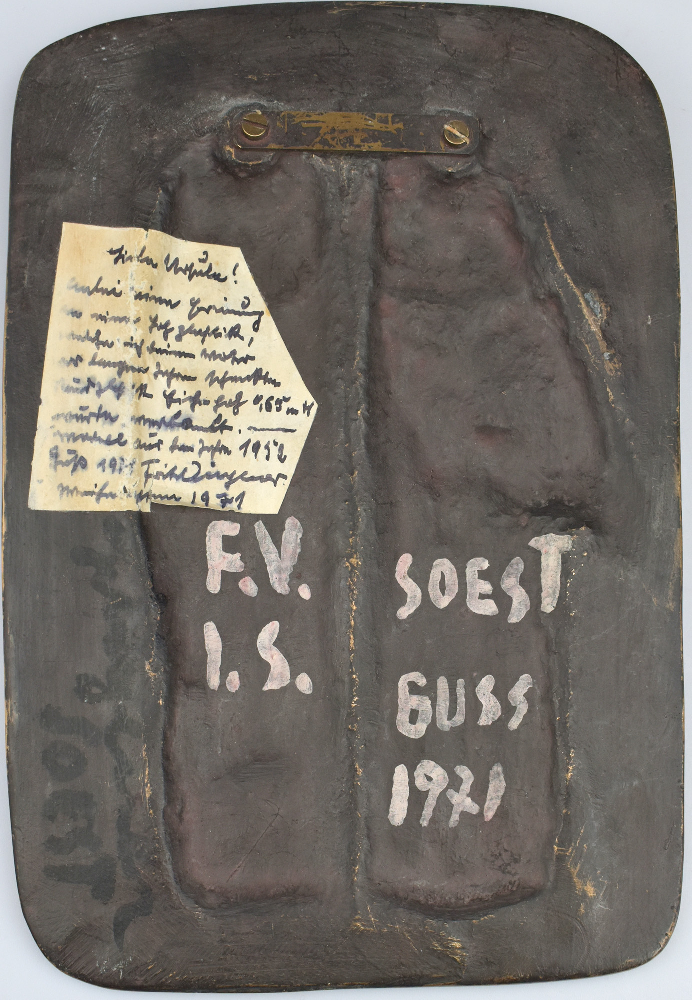Bronzerelief mit dunkler Patina. Rückseitig von Fritz Viegener in Weiß monogrammiert/beschriftet „F. V. I. S. Soest Guss 1971“, sowie mit kleinem aufgeklebtem Zettel mit 10-zeiliger handschriftlicher und von Fritz Viegener signierter Bemerkung zu dem Relief. Maße: 25,0 x 17,0 x 2,5 cm. Gewicht: 1,95 kg. Sehr guter Zustand.