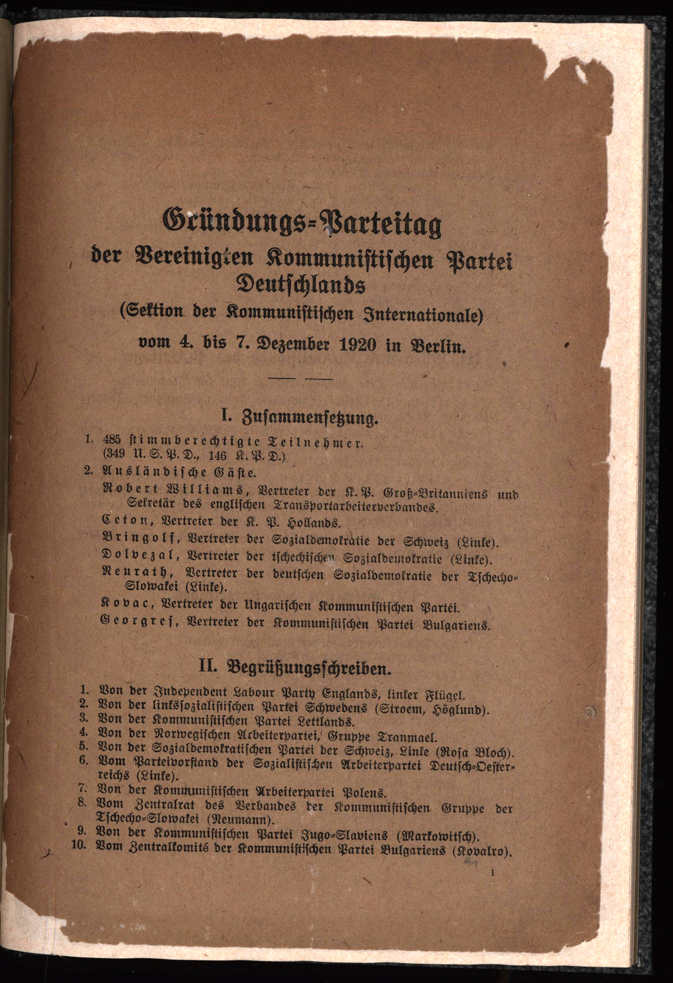 Gründungs-Parteitag der Vereinigten Kommunistischen Partei Deutschlands. (Sektion der Kommunistischen Internationale) vom 4. bis 7. Dezember 1920 in Berlin. Berlin, Druck in der Neustädtischen Vereinsdruckerei, 1920. 8°. 23,5 x 16 cm. 56 Seiten. Privater Pappband mit marmoriertem Deckelbezug und Deckelschild.