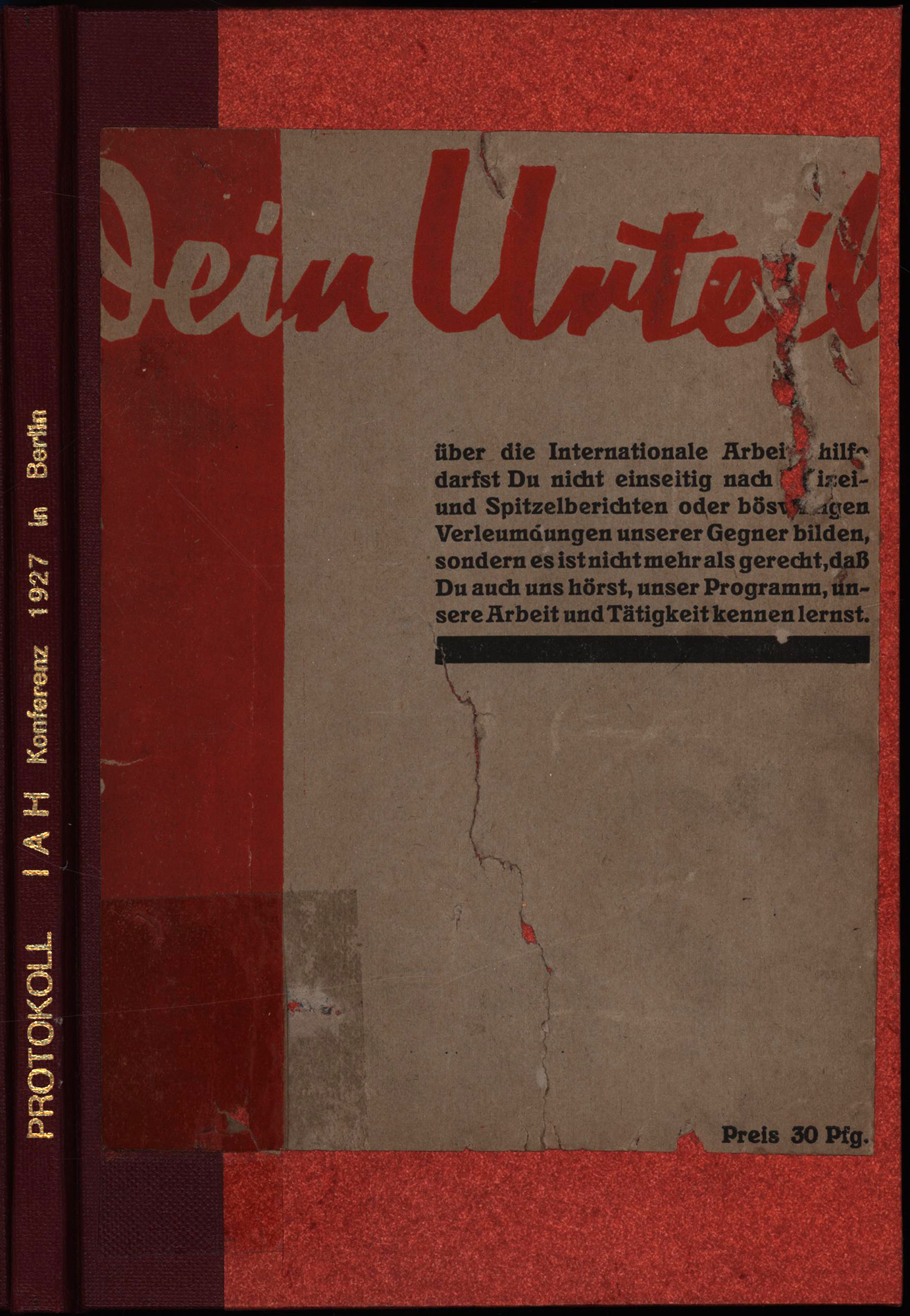 Protokoll der Internationalen IAH-Konferenz in Berlin am 20. November 1927 mit Erläuterungen und Ergänzungen. Berlin, Verlag der Internationalen Arbeiterhilfe, 1927. 8°. 21,5 x 14,5 cm. 84 Seiten. Bibliothekseinband in Halbleinen mit aufkaschierter Original-Broschur auf beiden Deckeln.