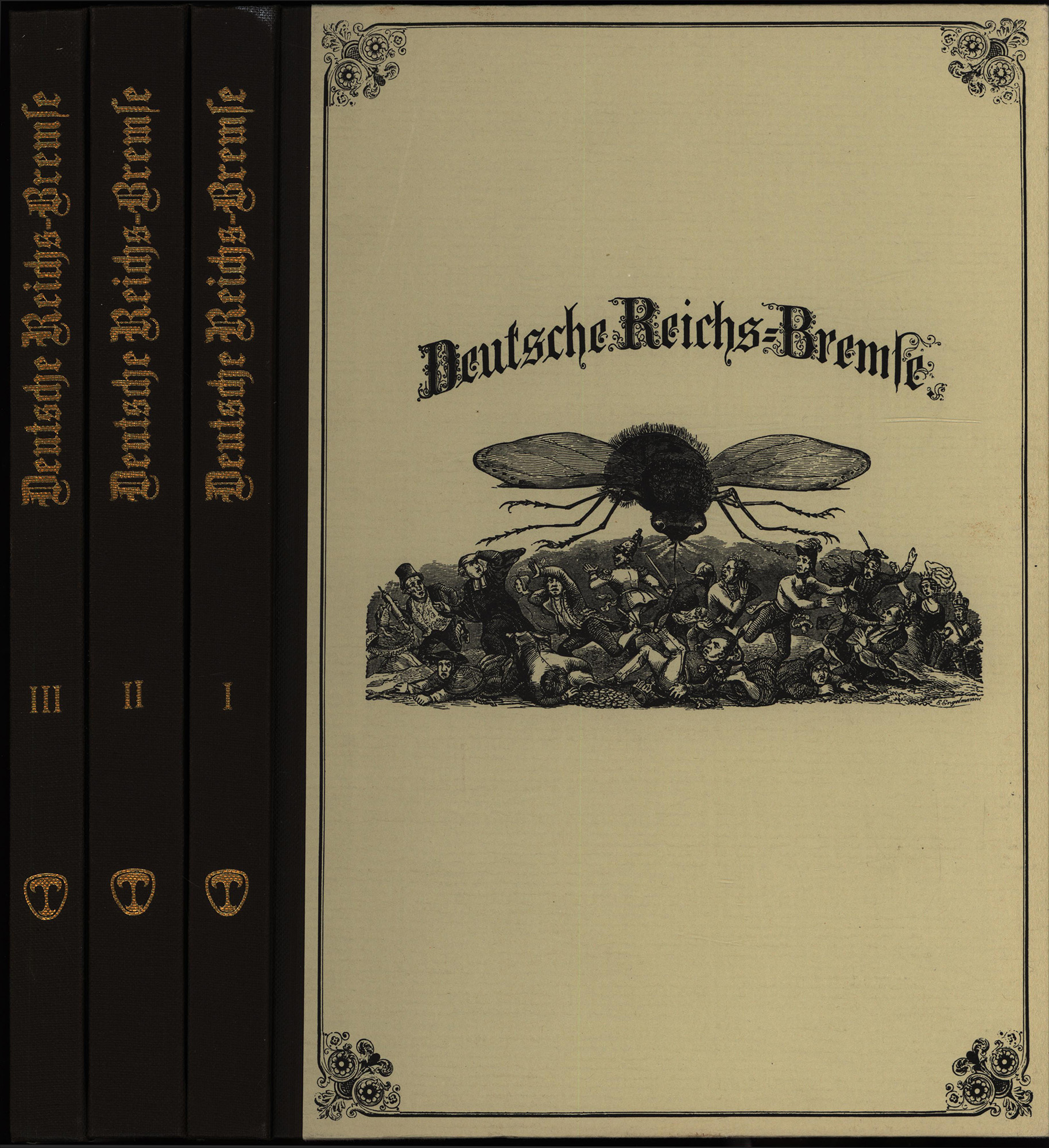 Estermann, Alfred (Hrsg.): Deutsche Reichs-Bremse 1849-1851. 3 Bände (komplett). Vaduz, Topos Verlag, 1981. 4°. 30,5 x 21,5 cm. XVIII, 176; 214; 160 Seiten. Original-Halbleinenbände mit Deckelillustration und goldgeprägtem Rückentitel. (= Bibliotheca Satirica, Band 1).