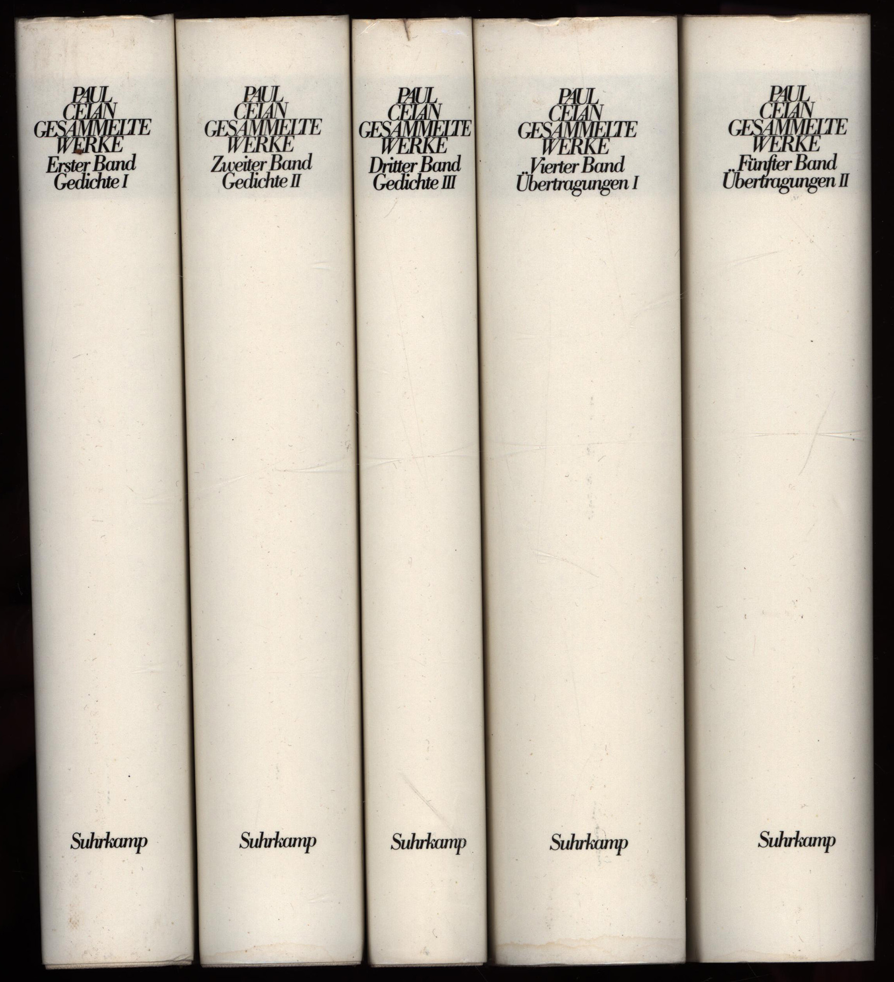 Celan, Paul: Paul Celan gesammelte Werke in fünf Bänden. Band 1-3: Gedichte. Band 4/5: Übertragungen I und II. Zweisprachig. Herausgegeben von Beda Allemann und Stefan Reichert unter Mitwirkung von Rudolf Bücher. 5 Bände (komplett). [Erstausgabe]. Frankfurt am Main, Suhrkamp Verlag, 1983. 8°. 20,5 x 13 cm. 318, 446, 233, 885, 665 Seiten. Original-Leinenbände mit Original-Schutzumschlägen.