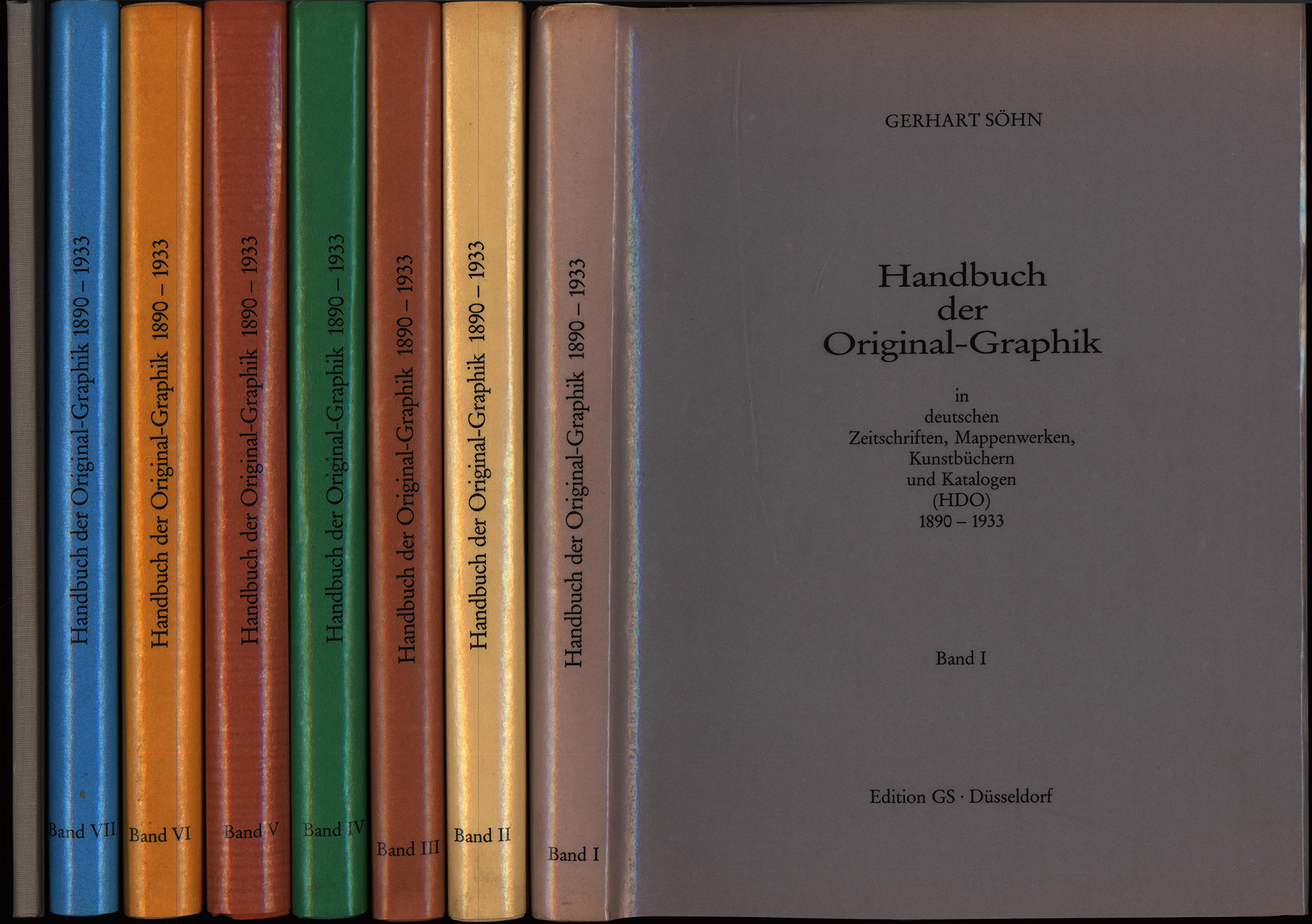 Söhn, Gerhart: Handbuch der Original-Graphik. In deutschen Zeitschriften, Mappenwerken, Kunstbüchern und Katalogen (HDO) 1890-1933. 8 Bände. [Band 1-7 und Register-Band.] Düsseldorf, Edition GS – Graphik-Salon Gerhart Söhn, 1989-1998. 4°. 28,5 x 22 cm. 260, 260, 259, 260, 283, 284, 232 und 42 Seiten. Original-Leinenbände mit Original-Schutzumschlägen (Register-Band ohne Schutzumschlag).