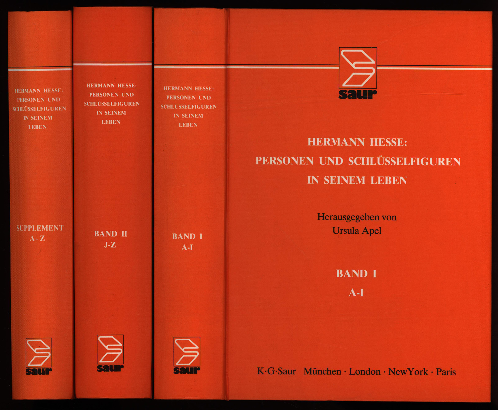 Apel, Ursula: Hermann Hesse. Personen und Schlüsselfiguren in seinem Leben ; ein alphabetisches annotiertes Namensverzeichnis mit sämtlichen Fundstellen in seinen Werken und Briefen. Herausgegeben von Ursula Apel mit Unterstützung des Komitees der Internationalen Hermann-Hesse-Kolloquien in Calw. Band 1: A-I. Band 2: J-Z. Band 3: Supplement A-Z. 3 Bände (komplett). München, London, New York und Paris, K.G. Saur, 1989-1993. 8°. 21,5 x 15 cm. 493, 1065, XXVII, 512 Seiten. Gebundene Original-Pappbände.