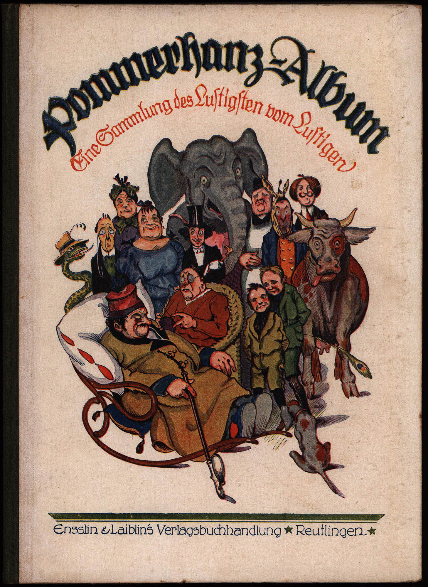 Pommerhanz, Karl: Pommerhanz-Album. Eine Sammlung des Lustigsten vom Lustigen. Reutlingen, Verlag Enßlin & Laiblin, 1928. 4°. 29 x 21 cm. 95 Blatt. Original-Halbleinenband mit Deckelillustration in Farbe.