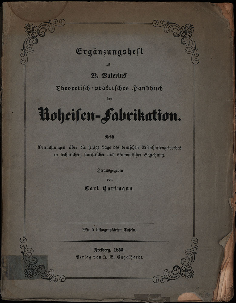 Hartmann, Carl [Hrsg.]: Ergänzungsheft zu B. Valerius’ theoretisch-praktisches Handbuch der Roheisen-Fabrikation. Nebst Betrachtungen über die jetzige Lage des deutschen Eisenhüttengewerbes in technischer, statistischer und ökonomischer Beziehung. Freiberg, J. G. Engelhardt, 1853. Groß-8°. 24 x 18,5 cm. VI, 241 Seiten. Original-Interimsbroschur.