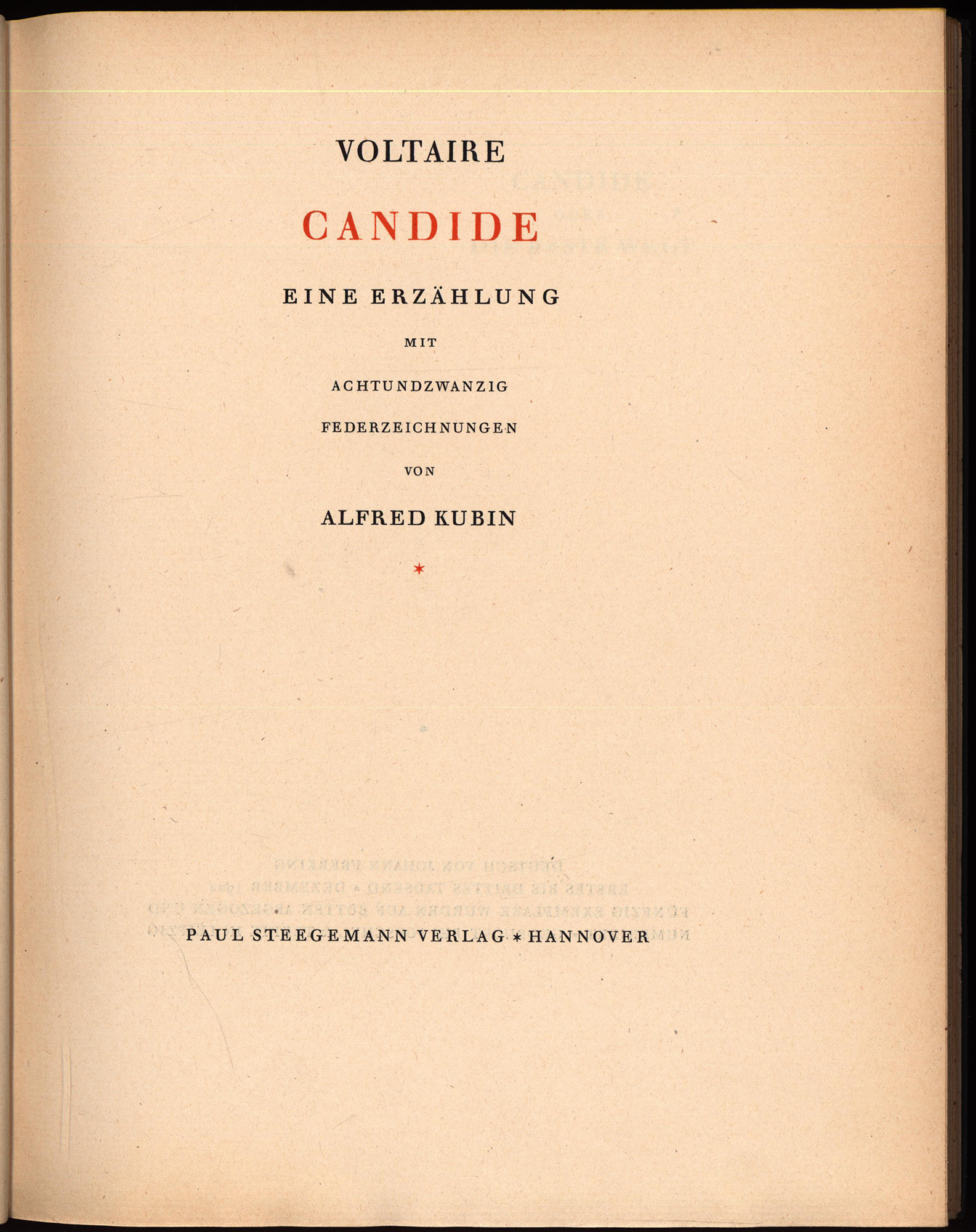 Kubin, Alfred – Voltaire: Candide. Eine Erzählung. Mit achtundzwanzig Federzeichnungen von Alfred Kubin. Deutsch von Johann Frerking. Hannover, Paul Steegemann Verlag, 1922. 4°. 29 x 23 cm. 145 Seiten. Original-Halbleinenband mit Original-Schutzumschlag.