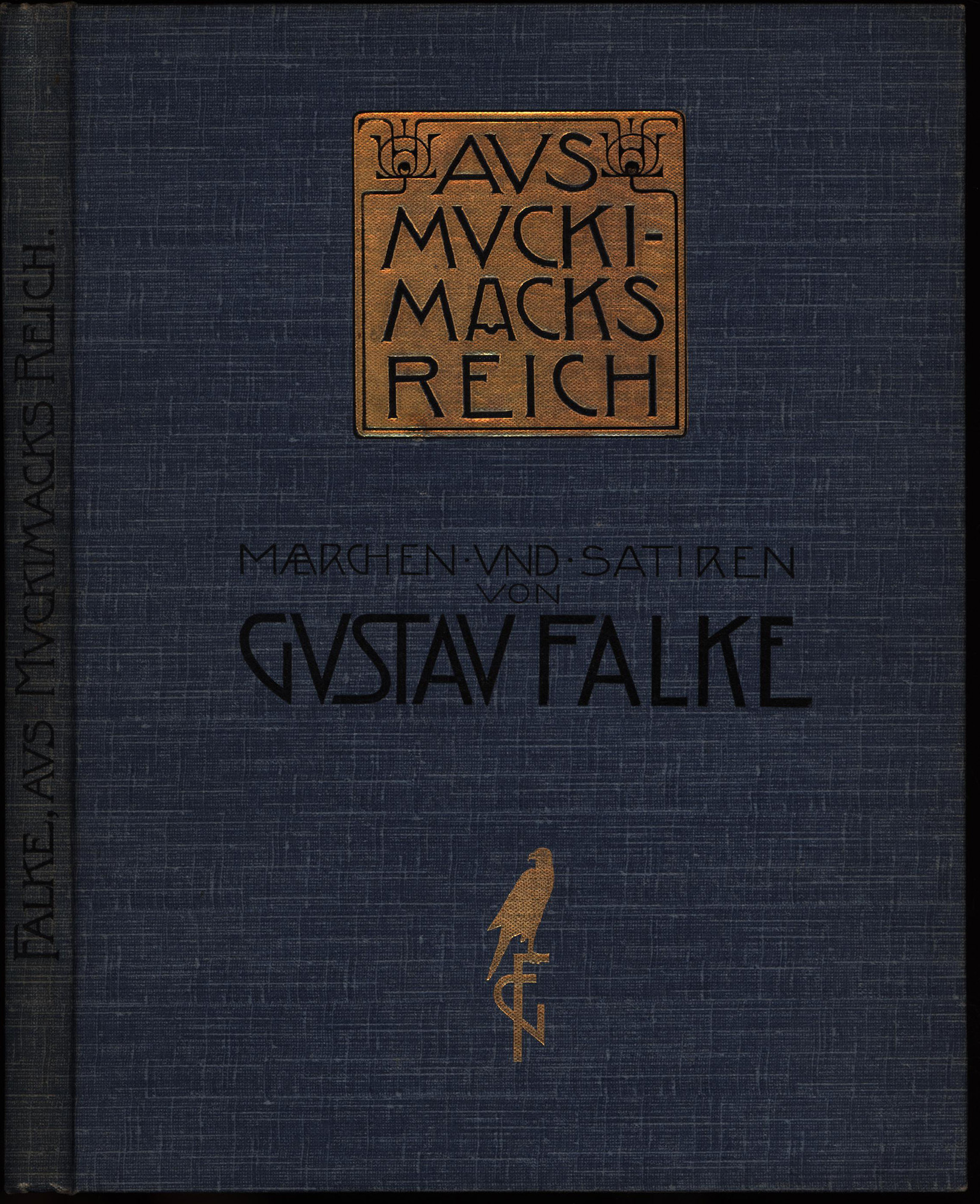 Falke, Gustav – Dasio: Aus Muckimacks Reich. Märchen und Satiren. Hamburg, Verlag Alfred Janssen, 1903. Groß-8°. 23,5 x 18 cm. 94 Seiten. Original-Leinenband mit Schwarz- und Goldprägung, illustrierten Vorsätzen und Rundum-Rotschnitt.