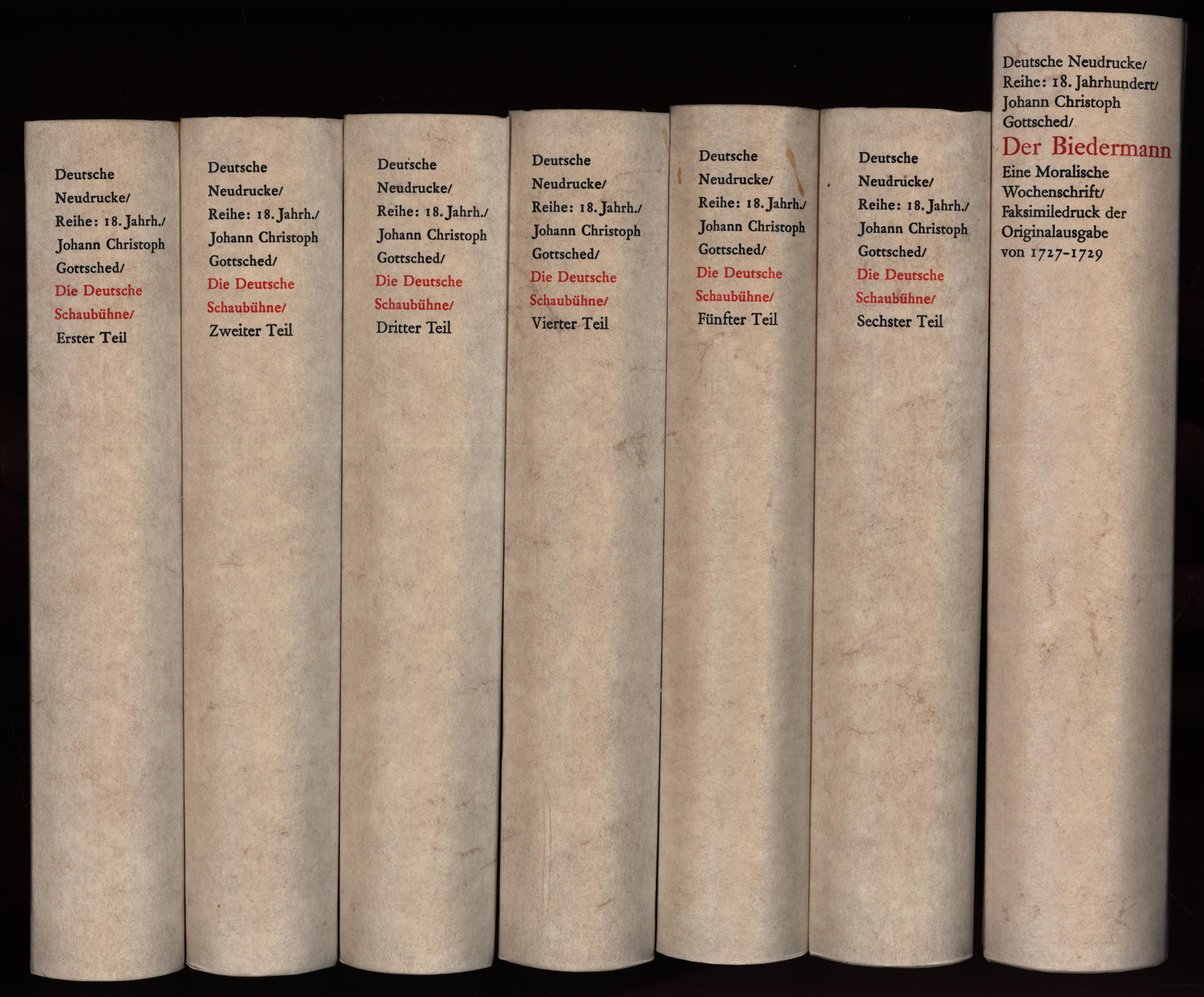 Gottsched, Johann Christoph: Die deutsche Schaubühne. Mit einem Nachwort von Horst Steinmetz. 1. – 6. Teil. 6 Bände (komplett). Beiliegend: Der Biedermann. Eine Moralische Wochenschrift. Herausgegeben von Wolfgang Mertens. 7 Bände. Stuttgart, Metzler, 1972-1975. 8°. 19,5 x 12 cm. 22 x 18 cm. 536, 503, 560, 504, 536, 564, 31, 200, 200, 35 Seiten. Gebundene Original-Pappbände. (Deutsche Neudrucke. Reihe Texte des 18. Jahrhunderts).