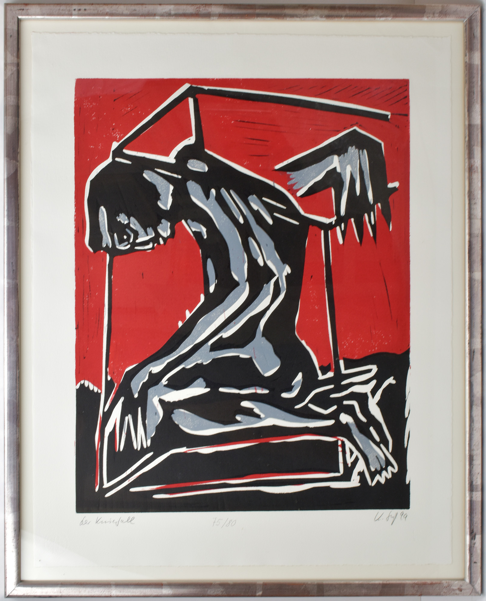 Süß, Klaus: Der Kniefall. [19]99. [Signierter Original-Farbholzschnitt, gerahmt / original color woodcut, framed]. (Klaus Süß, geboren am 1. September 1951 in Crottendorf. Deutscher Künstler).
