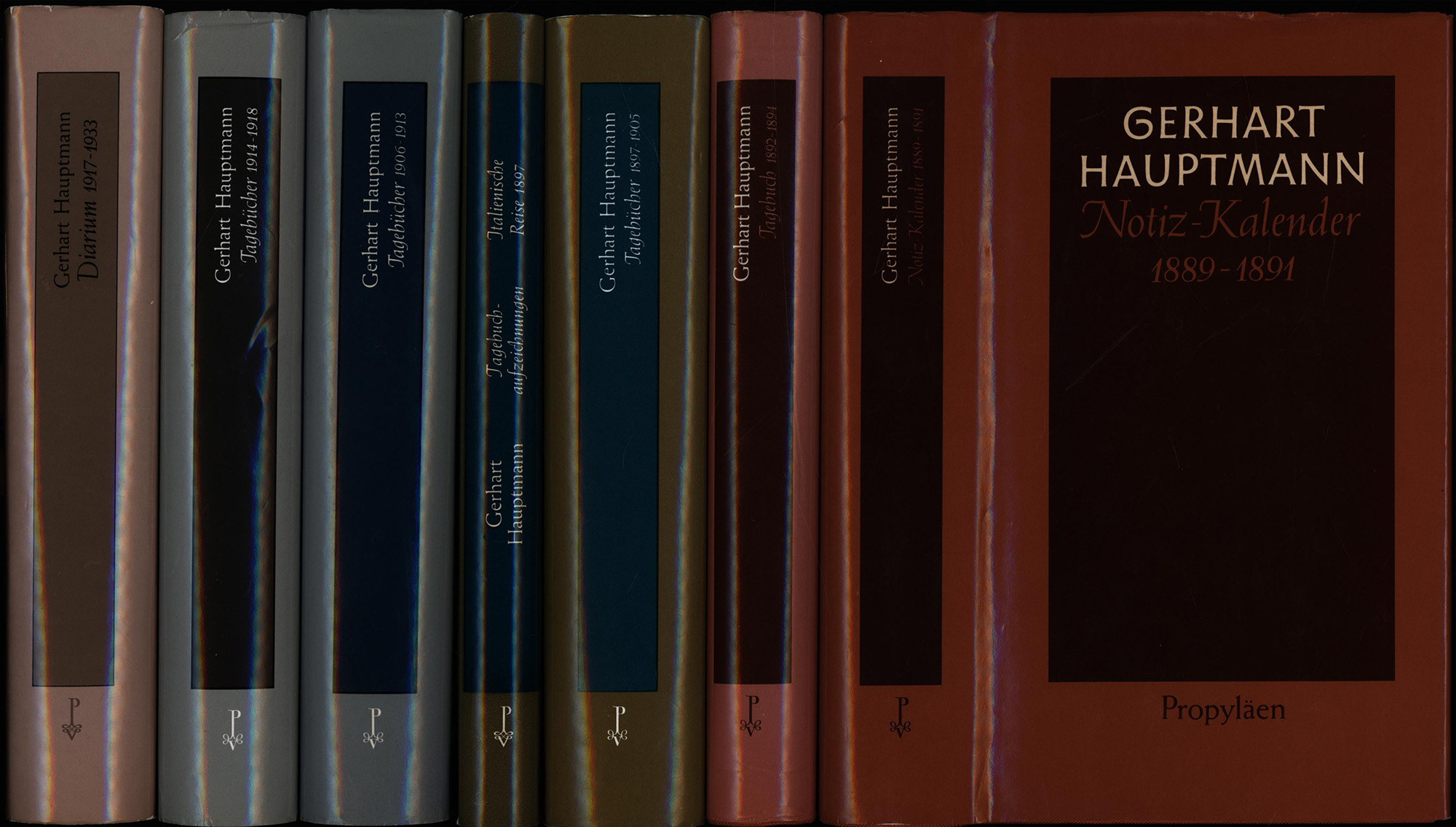 Hauptmann, Gerhart: Tagebücher. Herausgegeben von Martin Machatzke und Peter Sprengel. 1 Band: Notiz-Kalender 1889-1891. 2. Band: Tagebuch 1892-1894. 3. Band: Tagebücher 1897-1905. 4 Band: Italienische Reise 1897. Tagebuchaufzeichnungen. 5. Band: Tagebücher 1906 bis 1913. Mit einem Reisetagebuch Griechenland-Türkei 1907. 6. Band: Tagebücher 1914 bis 1918. 7. Band: Diarium 1917 bis 1933. 7 Bände (komplett). Frankfurt am Main und Berlin, Propyläen Verlag, 1976-1997. 8°. 20 x 12 cm. 531, 283, 790, 230, 754, 479, 335 Seiten. Original-Leinenbände mit Original-Schutzumschlägen.