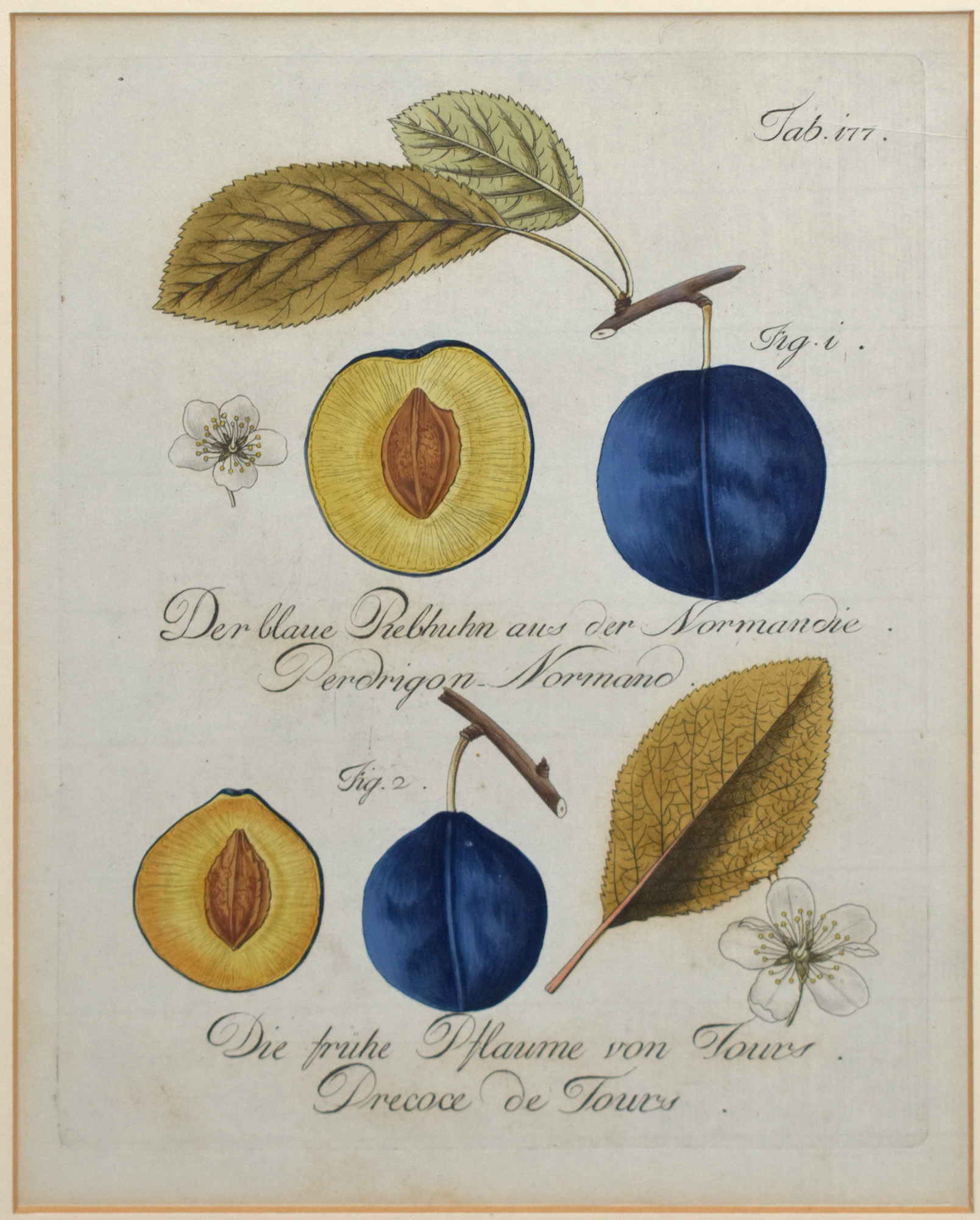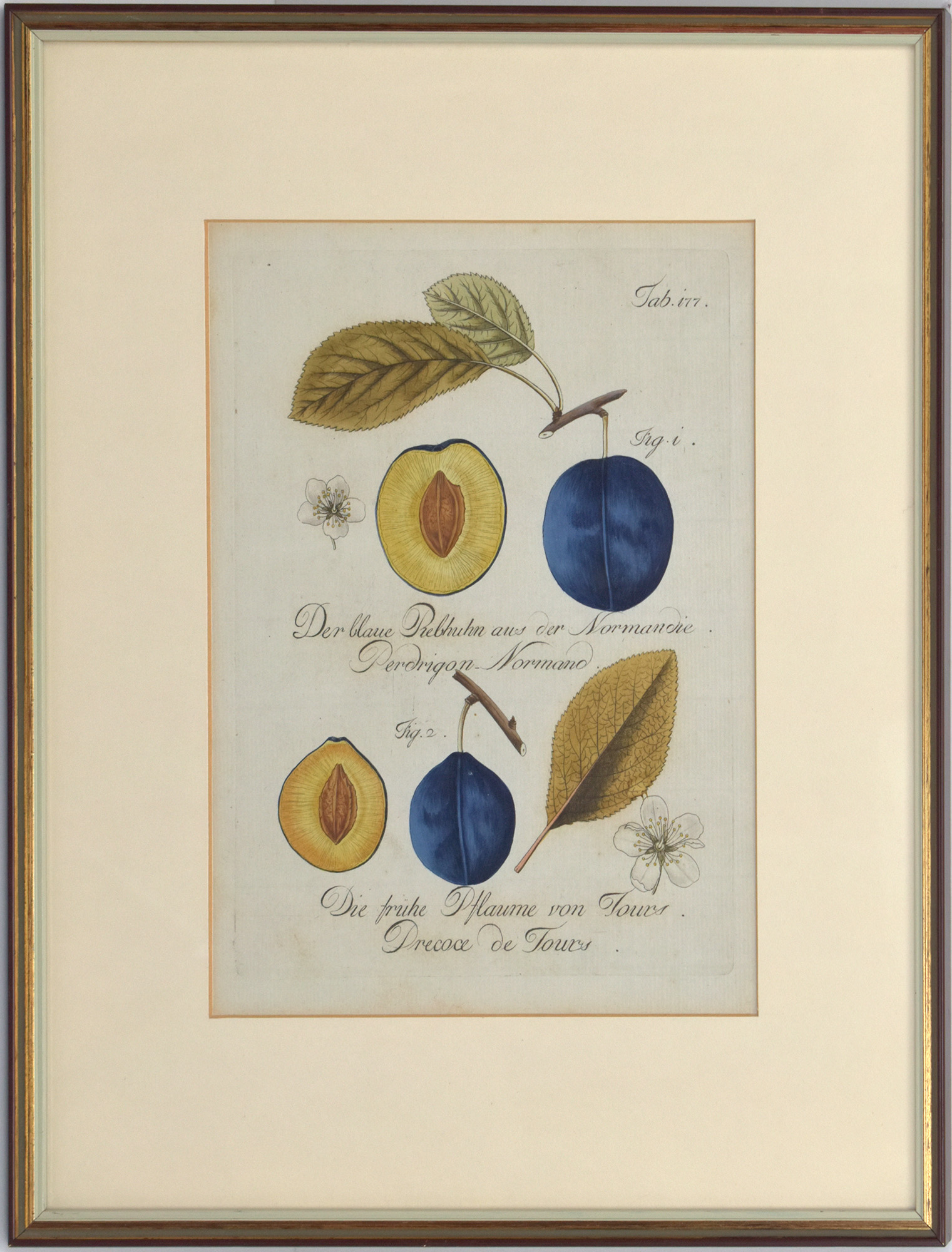 Kraft, Johann: Der blaue Rebhuhn aus der Normandie. Die frühe Pflaume von Tours. [1792-97]. [Original Kupferstich, kolloriert, gerahmt / Original copper engraving, colored, framed].