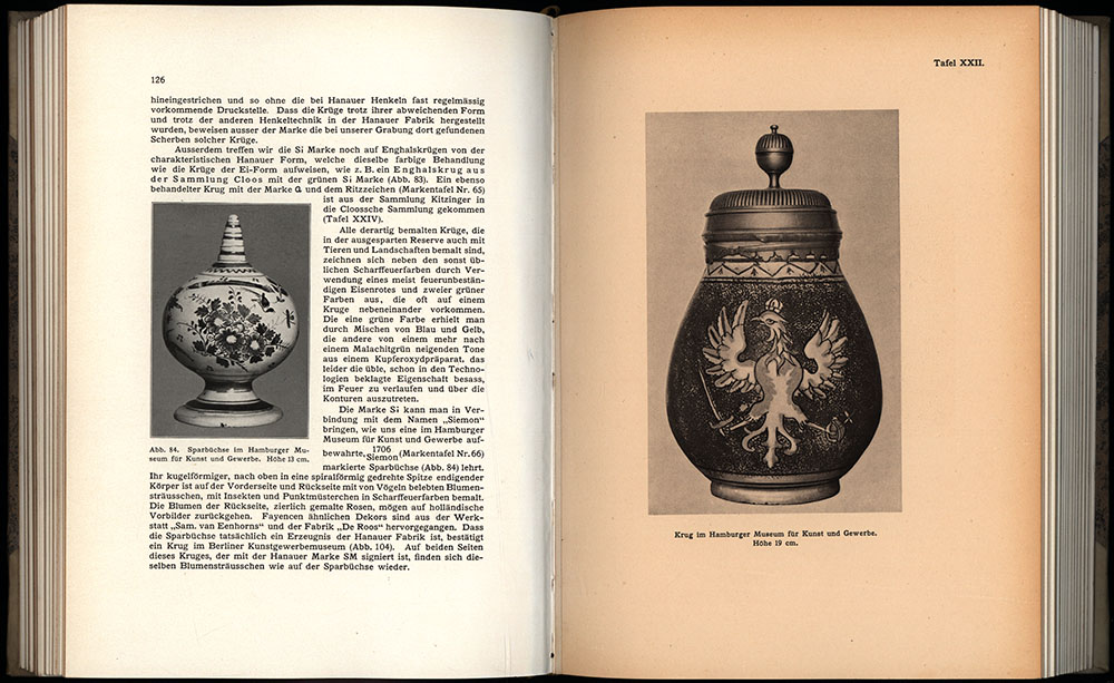 Zeh, Ernst: Hanauer Fayence. Ein Beitrag zur Geschichte der deutschen Keramik. Marburg in Hessen, N. G. Elwertsche Verlagsbuchhandlung, 1913. 4°. 26,5 x 19,5 cm. [5] Blatt, 240, LXXVIII Seiten, [13] Blatt, 7 (2) Seiten, XXXV zwischengebundene Tafeln. Original-Halbpergamentband mit reich goldgeprägtem Rückentitel, Buntpapierbezug, Lesebändchen und Kopfgoldschnitt. (= Beiträge zur Kunstgeschichte Hessens und des Rhein-Main-Gebietes, Band 1).