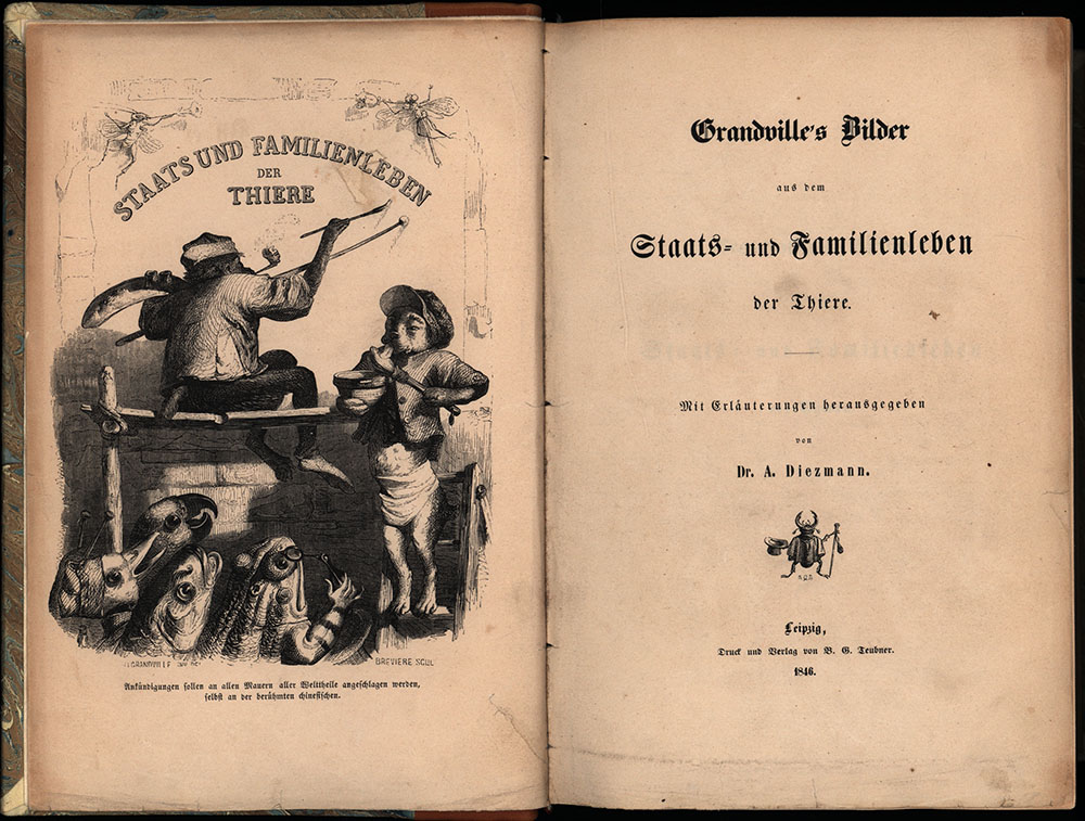 Grandville (d.i. Jean Ignace Isidore Gérard): Grandville’s Bilder aus dem Staats- und Familienleben der Thiere. Mit Erläuterungen herausgegeben von Dr. A. Diezmann. 2 Teile (in 1). Leipzig, Druck und Verlag von B. G. Teubner, 1846. 4°. 26,5 x 18,5 cm. Frontispiz, Titelblatt, (2) 464 Seiten. Neuer Halblederband mit goldgeprägtem Rückentitel und marmoriertem Bezugspapier.