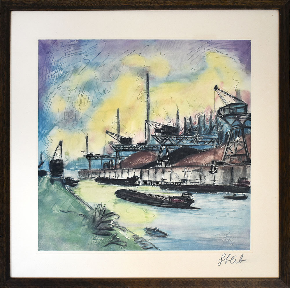 Steib, Neuss-Hafen. Signierte Original-Farblithografie, gerahmt