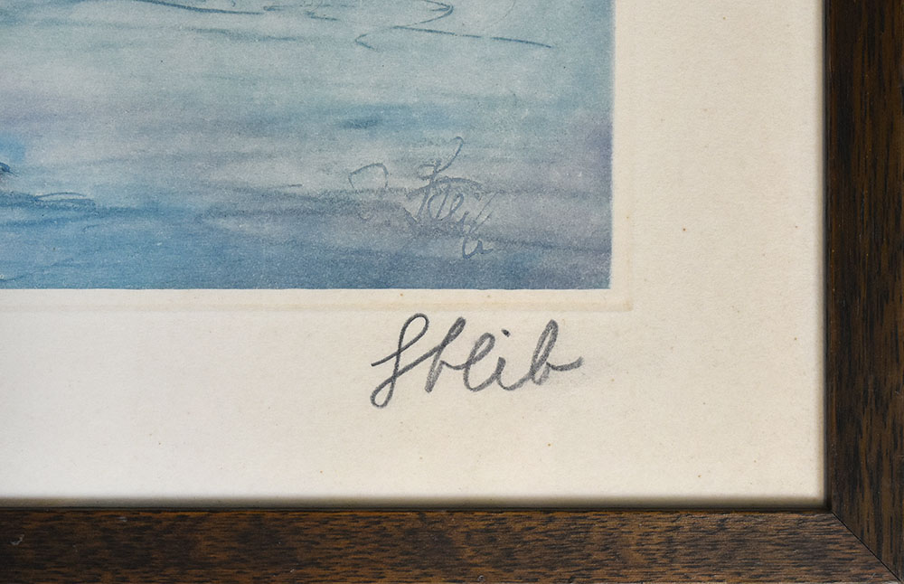 Original-Farblithografie von Josef Steib, im Druck signiert, rechts unterhalb der Abbildung erneut mit Bleistift signiert. Hinter Glas im braunen Holzrahmen gerahmt. Nicht ausgerahmt. Maße Abbildung: ca. 39 x 38,2 cm. Maße Rahmen: 53,6 x 51,8 cm. Braunes Nassklebeband auf der Rückseite des Rahmens mit kleinen Einrissen. Sehr guter Zustand. Original colour lithograph by Josef Steib, signed in the plate and signed a second time with pencil below the illustration. Framed behind glass in a brown wooden frame. Not examined out of frame. Sheet size: appr. 39 x 38.2 cm. Dimensions of frame: 53.6 x 51.8 cm. The brown wet adhesive tape on the back panel with some small tears. Very good condition.