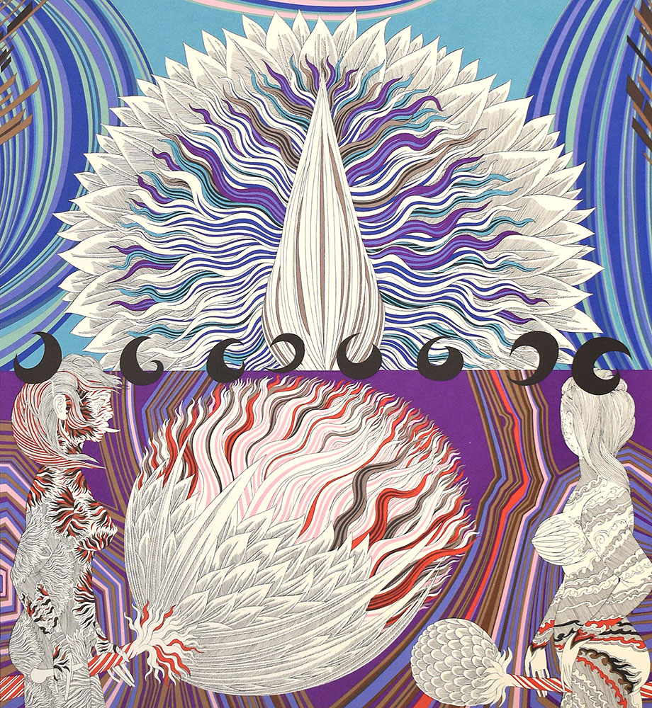 Hutter, Wolfgang: Mädchen mit praktikablen Blüten. 1973. [Signierte Original-Farblithografie / signed original colour lithograph]. (Wolfgang Hutter, geb. 13.12.1928 in Wien, gest. 26.09.2014, österreichischer Maler und Grafiker. Gründungsmitglied der Wiener Schule des Phantastischen Realismus. 1966-1997 Lehrtätigkeit an der Universität für angewandte Kunst Wien, ab 1974 als ordentlicher Professor).