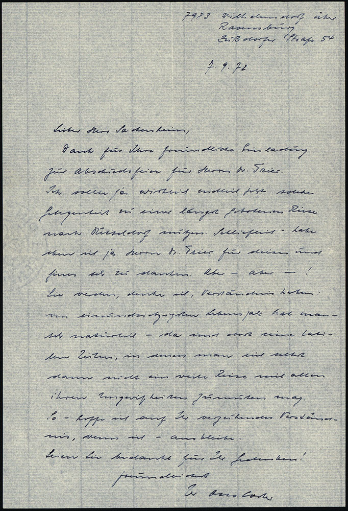 16-zeiliger signierter handschriftlicher Brief von Otto Coester an den Künstler Rolf Sackenheim, Professor an der Kunstakademie Düsseldorf, in schwarzer Tinte auf sehr leichtem (Japan-)Briefpapier mit Wasserzeichen, datiert 7.9.72, Blattgröße: 25,0 x 16,9 cm, mit Bezugnahme auf die kommende Abschiedsfeier für Eduard Trier, der seine Direktorenposition auf Lebenszeit an der Düsseldorfer Akademie anlässlich des Streits um Joseph Beuys’ Anstellung und dessen Entlassung durch Johannes Rau 1972 aufkündigte. Blatt mittig zweifach gefaltet. Provenienz: Aus der Sammlung des Düsseldorfer Sammlerpaares Ruth und Johannes Schreiber. Sehr guter Zustand.
