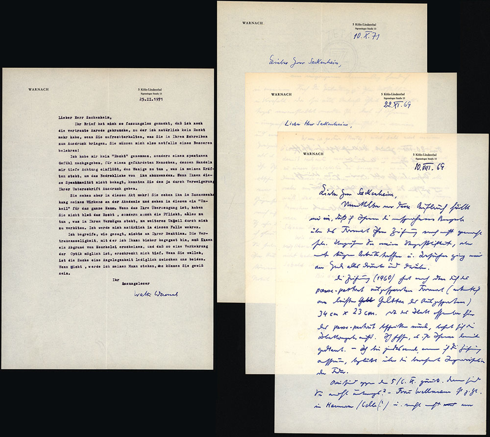 24-zeiliger maschinengeschriebener Brief von Walter Warnach an den Künstler und damaligen Professor an der Kunstakademie Düsseldorf Rolf Sackenheim, datiert 25.II.1971, in blauer Tinte signiert, auf persönlichem DIN-A4-Briefpapier mit Wasserzeichen. Einige Punzen der Buchstaben durch den harten Anschlag des Schreibers auf der Maschine durchgeschlagen, dort kleine Löchlein im Papier. Auszug aus dem Brief: „Die Vertrauensseligkeit, mit der ich Ihnen bisher begegnet bin, muß Ihnen ein Abgrund von Heuchelei erscheinen […]“, weiter: „Wenn Sie wollen, ist die Sache eine Angelegenheit lediglich zwischen uns beiden. Wenn nicht, werde ich meinen Mann stehen, des können Sie gewiß sein“. Beiliegend 3 weitere handschriftliche signierte Briefe von Walter Warnach an Rolf Sackenheim in blauer Tinte, datiert zwischen August 1969 und Oktober 1971, ebenfalls auf dem persönlichen Briefpapier. Alle 4 Bögen mittig zweifach gefaltet. Provenienz: Aus der Sammlung des Düsseldorfer Sammlerpaares Ruth und Johannes Schreiber. Zwei Zeilen eines handschriftlichen Briefs je mit kleinem Wasserfleck, Tinte dort minimalst verlaufen, ansonsten sehr guter Zustand.
