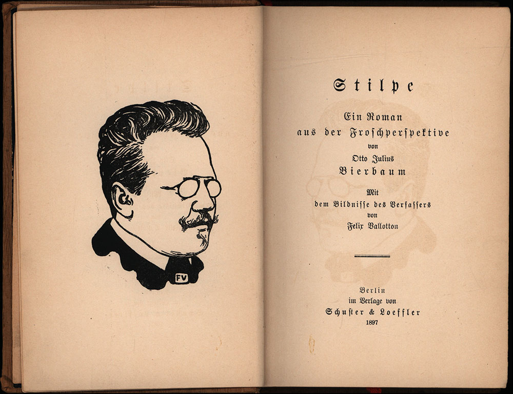 Bierbaum, Otto Julius: Stilpe. Ein Roman aus der Froschperspektive. [Erstausgabe.] Berlin, Schuster & Loeffler, 1897. 8°, 19 x 13,5 cm. 415 Seiten. Privater Pappband mit Strukturpapierbezug und goldgeprägtem Rückentitel.
