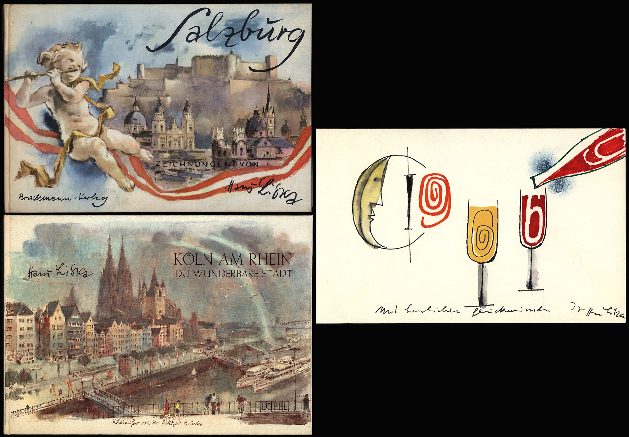 Liska, Hans: Konvolut aus 2 Büchern mit Autografen und Original-Zeichnung. Band 1: Salzburg. Band 2: Köln am Rhein, Du wunderbare Stadt. München und Bergisch Gladbach, Verlag F. Bruckmann/Gustav Lübbe Verlag, 1960/1973. Quer-8°. 20,5 x 30 cm. Unpaginiert.