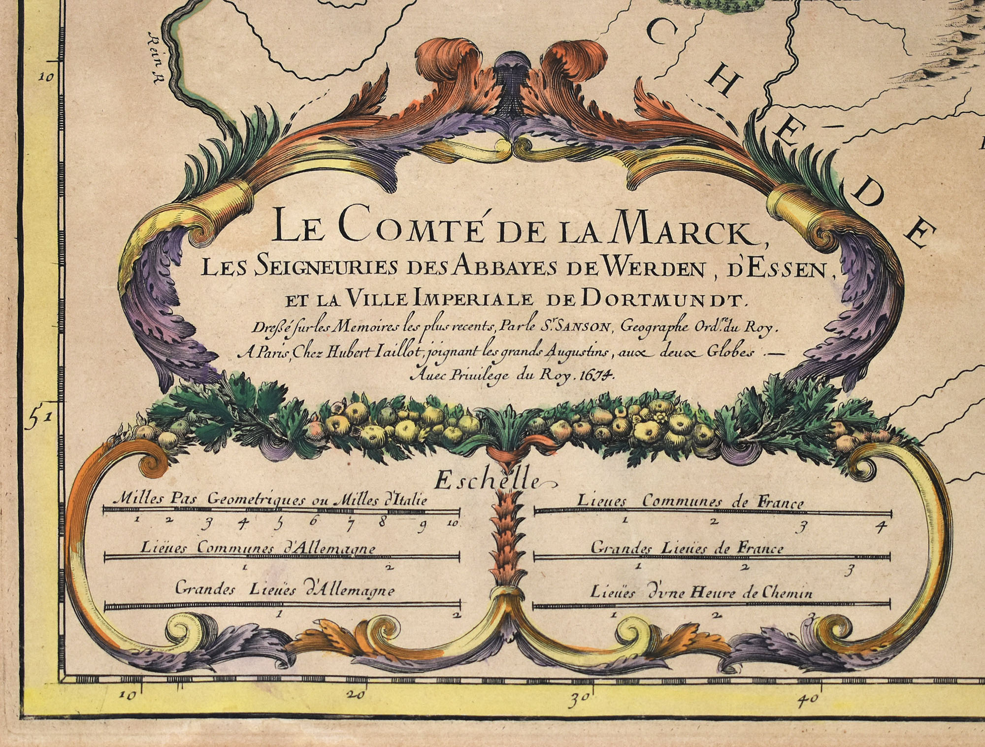 Coloured original-copper engraving by Nicolas Sanson, 1674, printed at Hubet Jaillot: Le Comté de la Marck. Les Seigneuries des Abbayes de Werden, d’Essen, et la Ville Imperiale de Dortmundt. With title cartouche and miles indicator. Copper engraving behind green linen passepartout framed in gilt wooden frame, behind glass. Not examined out of frame. Measurements plate: 43.4 x 57.4 cm. Measurements frame: 64.0 x 76.5 cm. Frame with traces of use, rubbed, backside with a wire rope for mounting. Fine condition.
