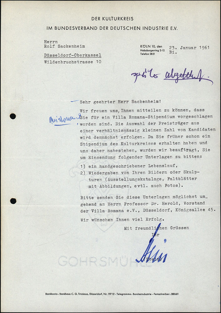16-zeiliger maschinengeschriebener Brief von Gustav Eugen Stein in seiner Funktion als Vorstand des Kulturkreises im Bundesverband der Deutschen Industrie e.V. (BDI) an den Künstler Rolf Sackenheim mit der Ankündigung seiner Ernennung zum Kandidaten des Villa Romana-Stipendiums sowie der Bitte um Einsendung der entsprechenden Unterlagen, datiert 23.Januar 1961, von Gustav Eugen Stein in blauer Tinte signiert, auf Gohrsmühle Papier mit Wasserzeichen im DIN-A4-Format, mittig zweimal gefaltet, links seitlich gelocht. Mit 2 Randnotizen von Rolf Sackenheim: „Meistermann!“ [Georg Meistermann, damaliges Mitglied des Beirats] und „später abgelehnt“. Provenienz: Aus der Sammlung des Düsseldorfer Sammlerpaares Ruth und Johannes Schreiner. Allgemein sehr guter Zustand.