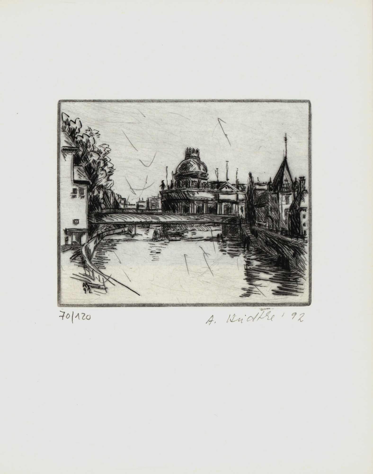 Heidtke, Alvina: Berliner Bilder 1989-1992. Ausstellung 127. 21. August – 17. Oktober 1992. [Mit einer signierten Original-Grafik.] Berlin, Galerie Taube, 1992. 8°. 19 x 15 cm. Unpaginiert. Original-Klammerbroschur.