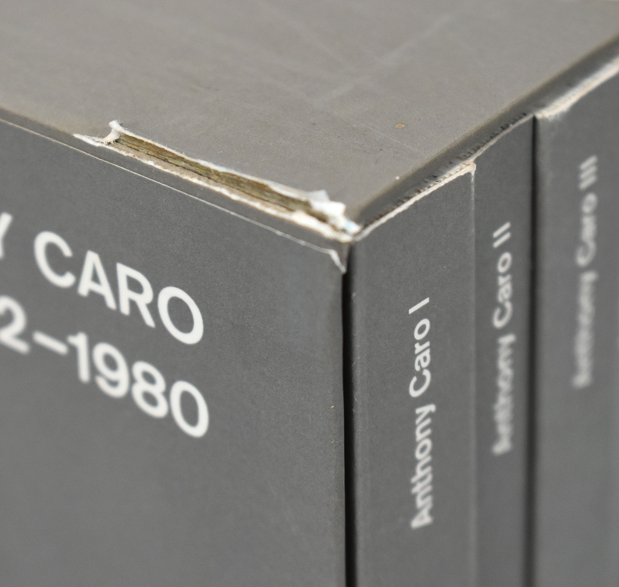 Caro, Anthony – Blume, Dieter: The sculpture of Anthony Caro, 1942-1980. A catalogue raisonné. Band 1: Table and related sculptures 1966-1978. Band 2: Table and related sculptures 1979-1980. Miscellaneous sculptures 1974-1980. Bronze sculptures 1976-1980. Band 3: Steel sculptures 1960-1980. Band 4: Student work 1942-1953. Figurative sculptures 1954-1959. 4 Bände (komplett). [Werkverzeichnis.] Köln, Galerie Wentzel, o.J. 8°. 21 x 20 cm. 271, 183, 248 und 53 Seiten. Original-Broschuren im Original-Pappschuber.