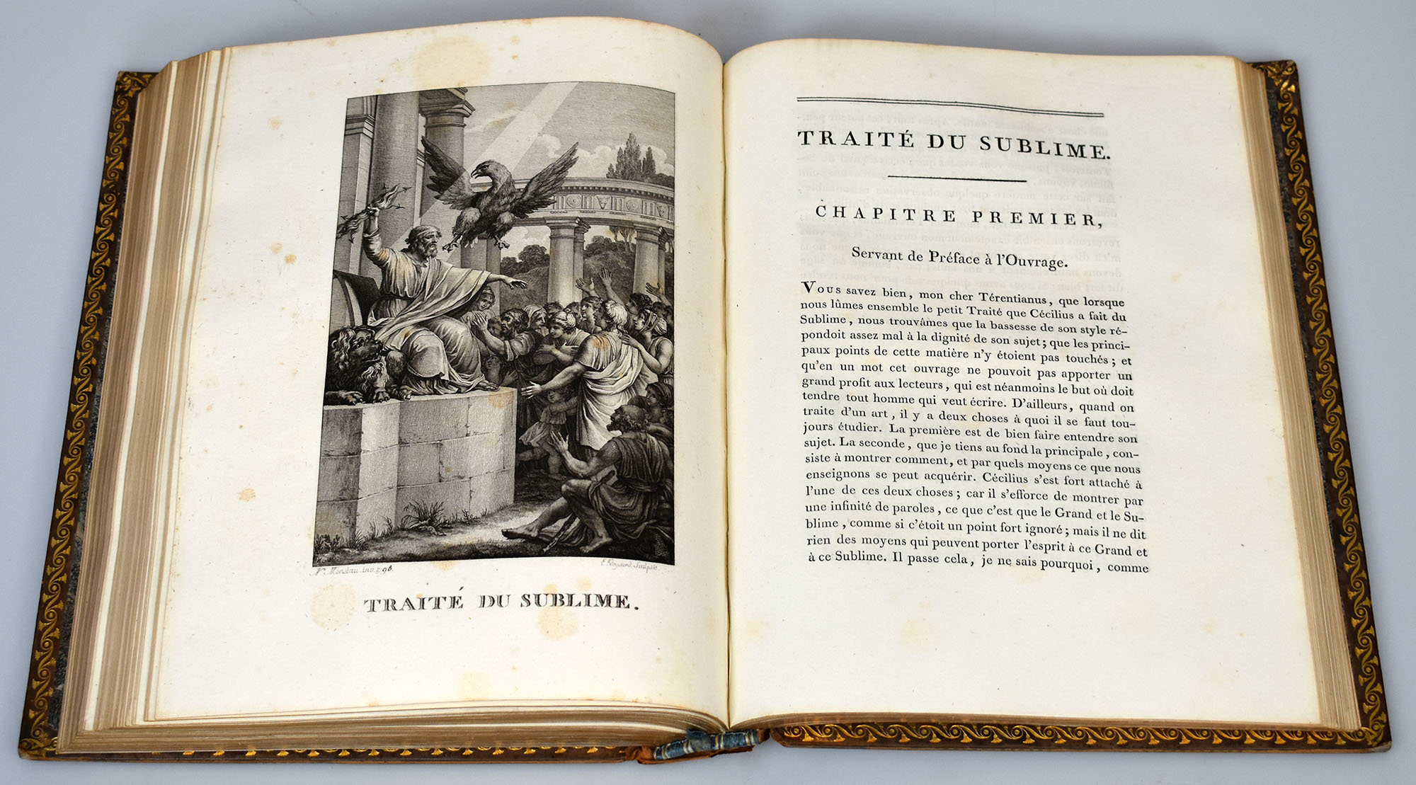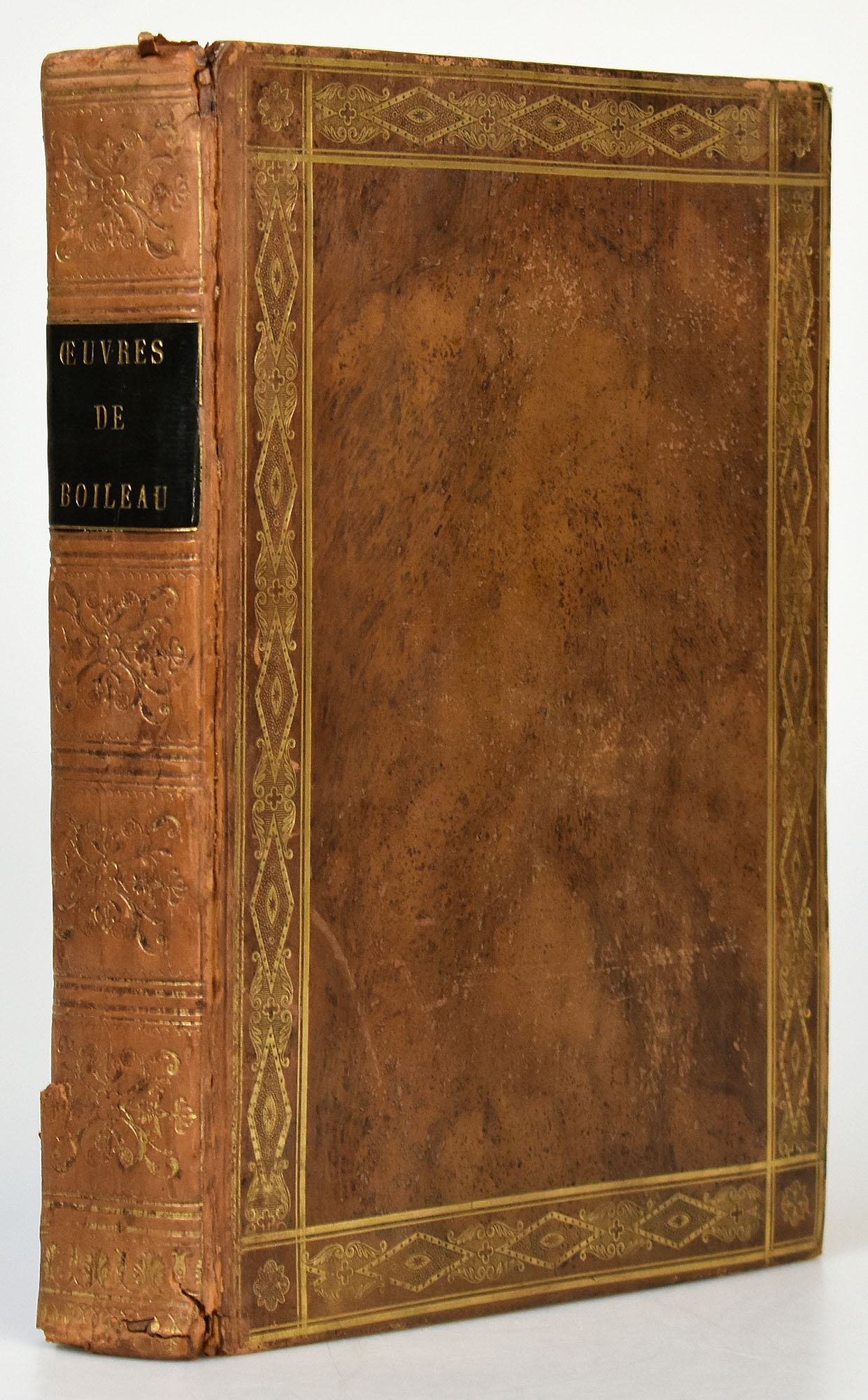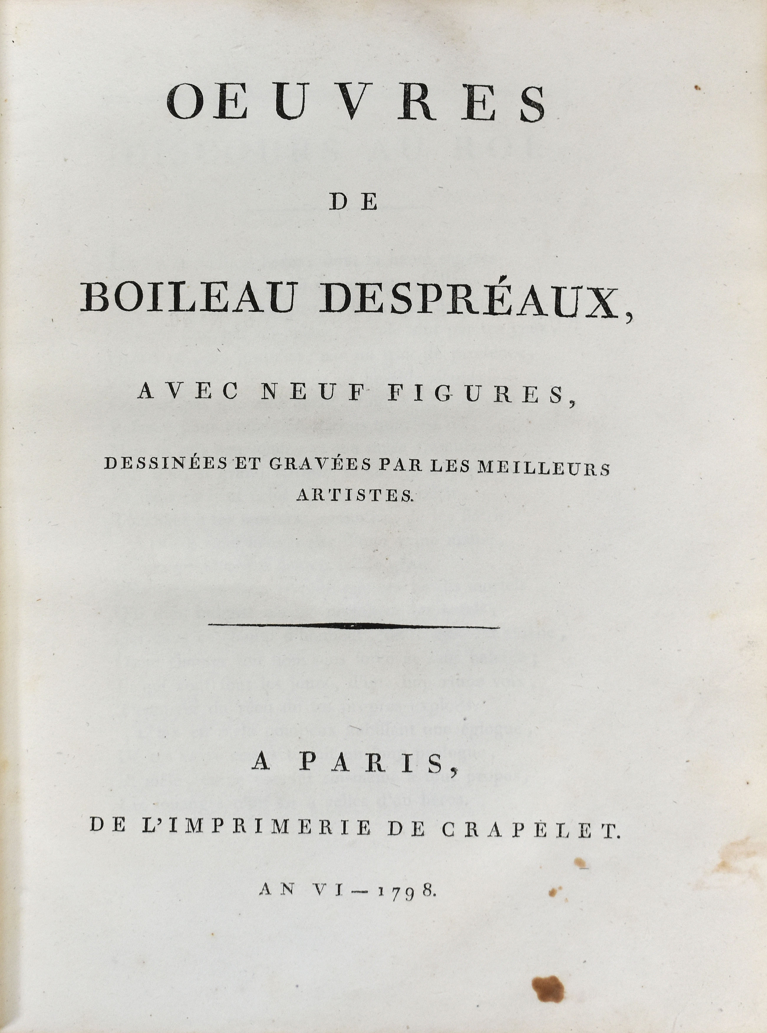 Boileau Despréaux, Nicolas: Oeuvres de Boileau Despréaux. Avec neuf figures, dessinées et gravées par les meilleurs artistes. Paris, de l’Imprimierie de Crapelet, 1798. 4°: 27 x 21 cm. Vortitel, Frontispiz, Titelblatt, 535, X Seiten. Ganzlederband mit goldgeprägten Innen- und Außenfileten, goldgeprägtem Rückentitel auf schwarzem Lederschildchen und Rundum-Goldschnitt.