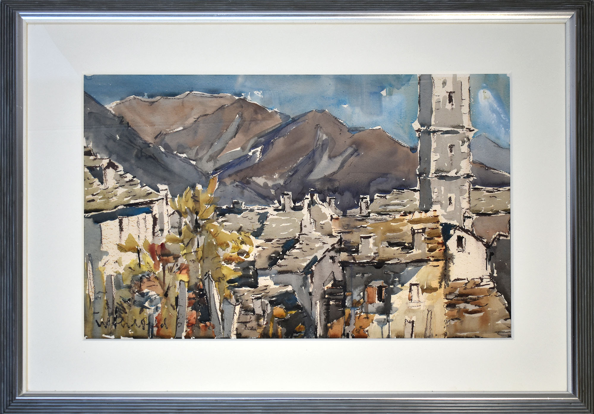 Wohlfeld, Walter: Stadt am Fuße eines Berges (Ascona). 1963. [Signiertes Original-Aquarell, gerahmt / signed original watercolour painting, framed.] (Walter Wohlfeld, geb. 26.06.1917 in Hamburg, gest. 26.02.2002 in Wuppertal, deutscher Künstler, der als „Maler des Bergischen Landes“ galt. Mitglied der internationalen Gruppe rbk).