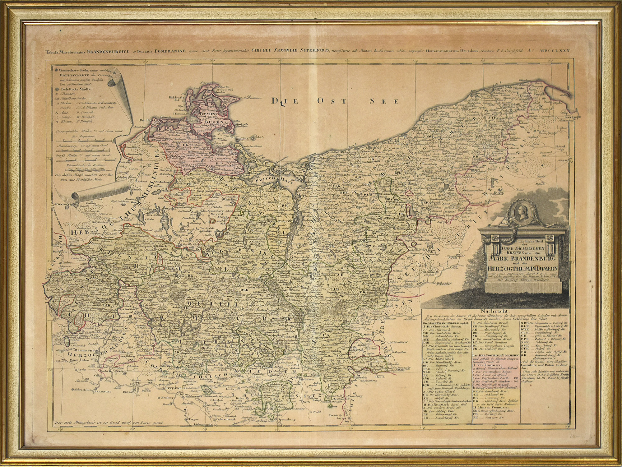 Güssefeld, Franz Ludwig: Der nördliche Theil des Obersächsischen Kreises oder die Mark Brandenburg und das Herzogthum Pommern. 1780. [Original-Kupferstich, gerahmt / original copper engraving, framed]. (Franz Ludwig Güssefeld, geb. 06.12.1744 in Osterburg, gest. 17.06.1808 in Weimar, preußischer Kartograph).