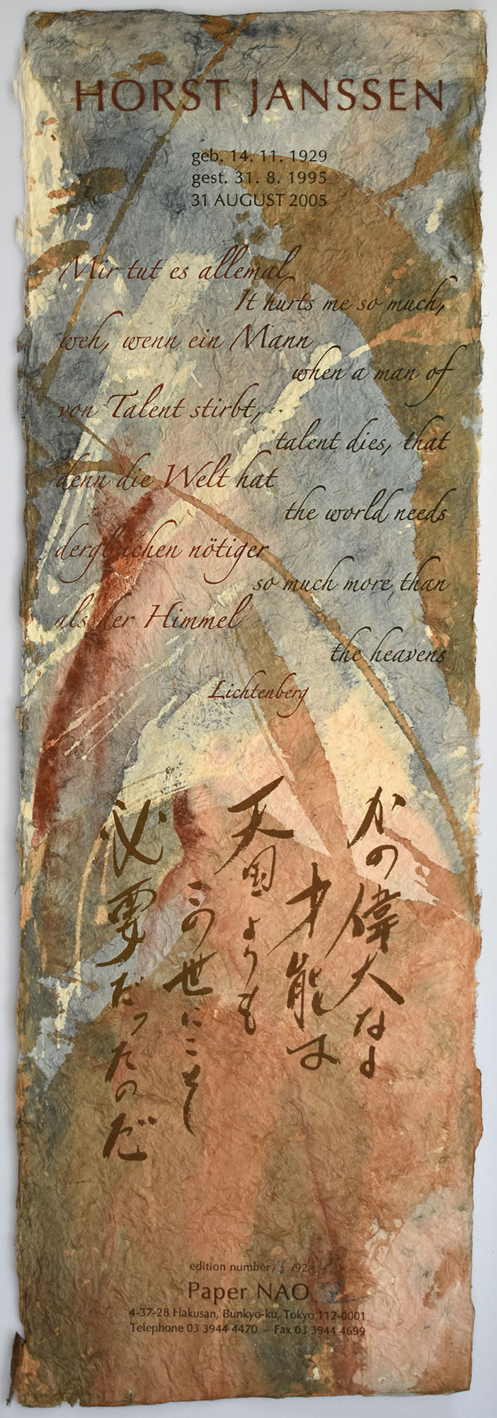 Nummer 16 von 92 Exemplaren der Mappenedition. 2 gefärbte handgemachte Papiere von Naoaki Sakamoto, Blattgrößen: jeweils ca. 75,5 x 23,5 cm. Erstes Blatt „Janssen Baum III“, mit gedrucktem Titel, darunter eine Vignette von Horst Janssen (das schwarzrote Herz), unten mit gedrucktem Impressum und rotem Stempel mit dem japanischen Zeichen für ‚Leben’, erschien in einer Auflage von 100 Exemplaren. Zweites Blatt mit einem gedruckten Text von Georg Christoph Lichtenberg in Deutsch, Englisch und japanischer Kalligrafieschrift, am unteren Rand mit gedruckten Angaben zur Edition, nummeriert (16/92) und von Noaki Sakamoto mit Bleistift signiert. Beiliegend ein feines halbtransparentes, unbedrucktes Schutzblatt. Dazu ein halbtransparentes Blatt im DIN-A-4-Format mit Einführungstext in Englisch, am unteren Rand von Naoaki Sakamoto mit Tinte signiert und ebenfalls mit dem roten Stempel. Zusammen in einer zarten Papierhülle, mit bedrucktem Titel und Druckangaben sowie der Nummerierung (16/92). Sehr guter Zustand.