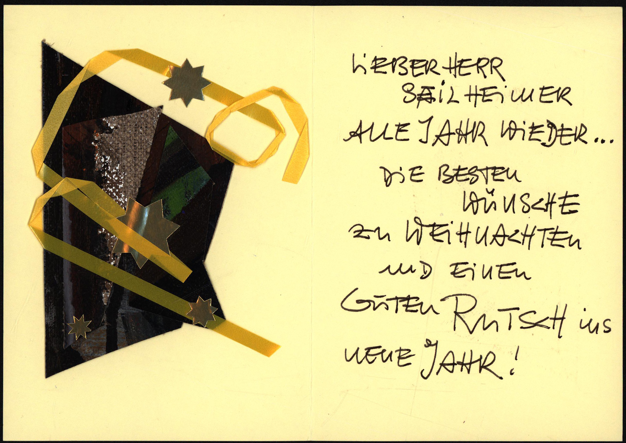 Original assemblage by Erwin Eichbaum on a folded paper card in yellow, with some pieces of painted canvas, yellow ribbon and golden star stickers. Besides on the right a 7-lined letter to Ralf Seilheimer with christmas greetings, not signed. Sheet size (in total): 14.8 x 21.0 cm. Size of the collage: appr. 12.0 x 9.5 cm. Provenance: From the estate of the art collector and author Ralf Seilheimer. Enclosed the original envelope from Erwin Eichbaum to Ralf Seilheimer, both addresses handwritten. Very good condition.