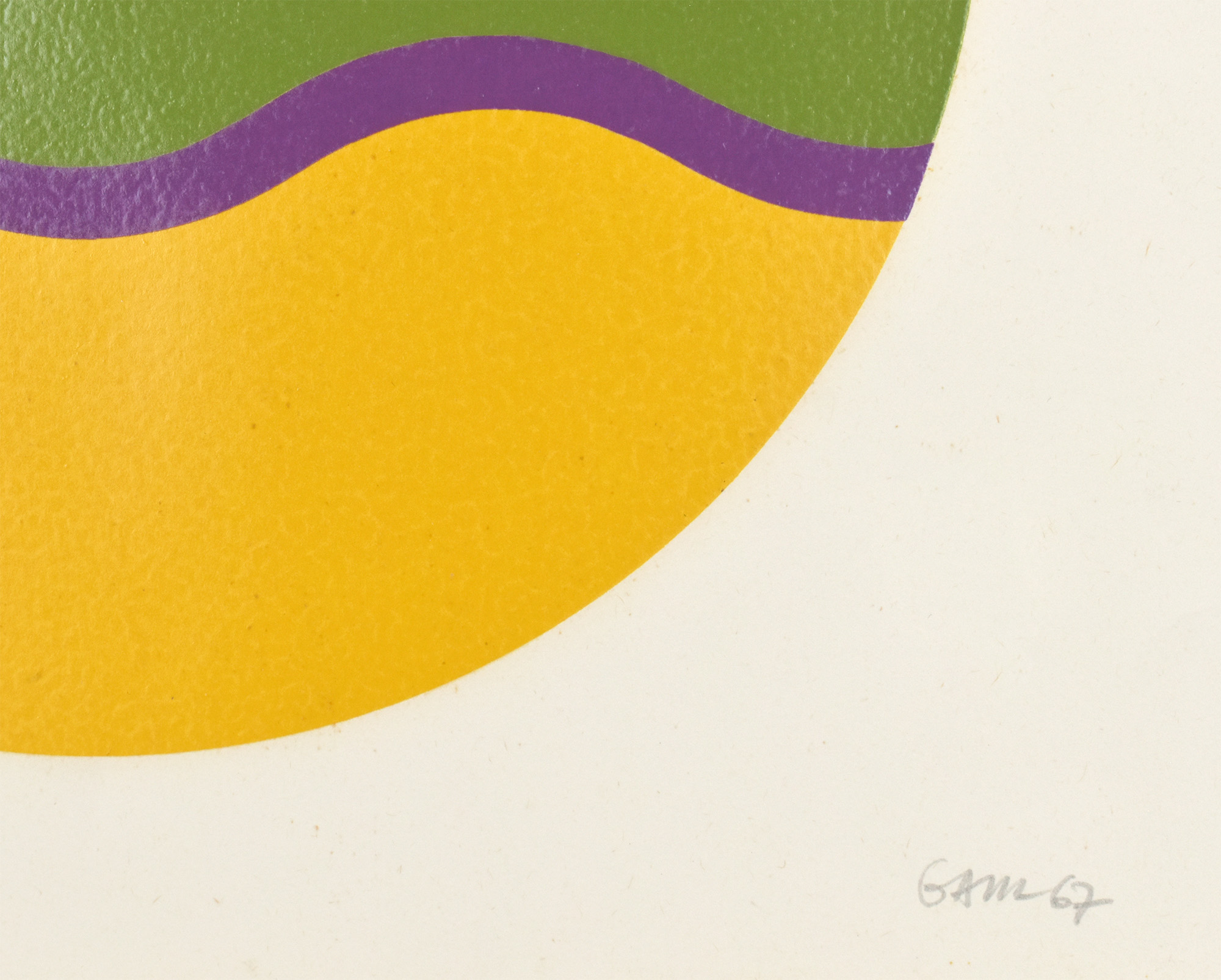 Nummer 2 von 100 Original-Grafiken (Siebdruck) von Winfred Gaul, in der unteren rechten Blattecke mit Bleistift signiert und datiert (67). Maße Abbildung: 20 cm Duchmesser. Maße Blatt: 25,9 x 25,9 cm. Blatt alterungsbedingt mit wenigen winzigen, kaum sichbaren Flecken. Guter bis sehr guter Zustand.