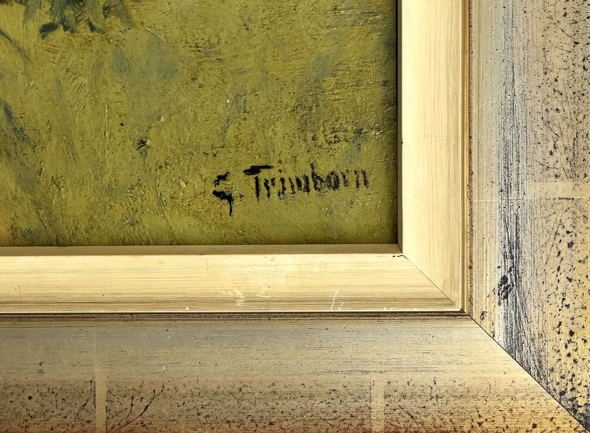 Original-Gemälde [in Öl] von Gottfried Trimmborn, beidseitig bemalt, vorderseitig rechts unten innerhalb des Bildbereichs in Schwarz signiert. Im hellen Holzrahmen gerahmt, ohne Hinterdeckel, rückseitig mit einer Kordel zur Aufhängung. Beide Motive sind sichtbar, rückseitig jedoch mittig mit einem aufgeklebten Papierschildchen im Motiv, mit Angaben zum Künstler, ebenfalls rückseitig rundherum mit schwarzem Gewebeband umklebt, motiv beschnitten und staubig. Nicht ausgerahmt. Maße Motiv (vorderseitig): 45,0 x 34,2 cm. Maße Rahmen: 57,5 x 47,0 cm. Rahmen mit nur leichten Gebrauchsspuren. Guter bis sehr guter Zustand.