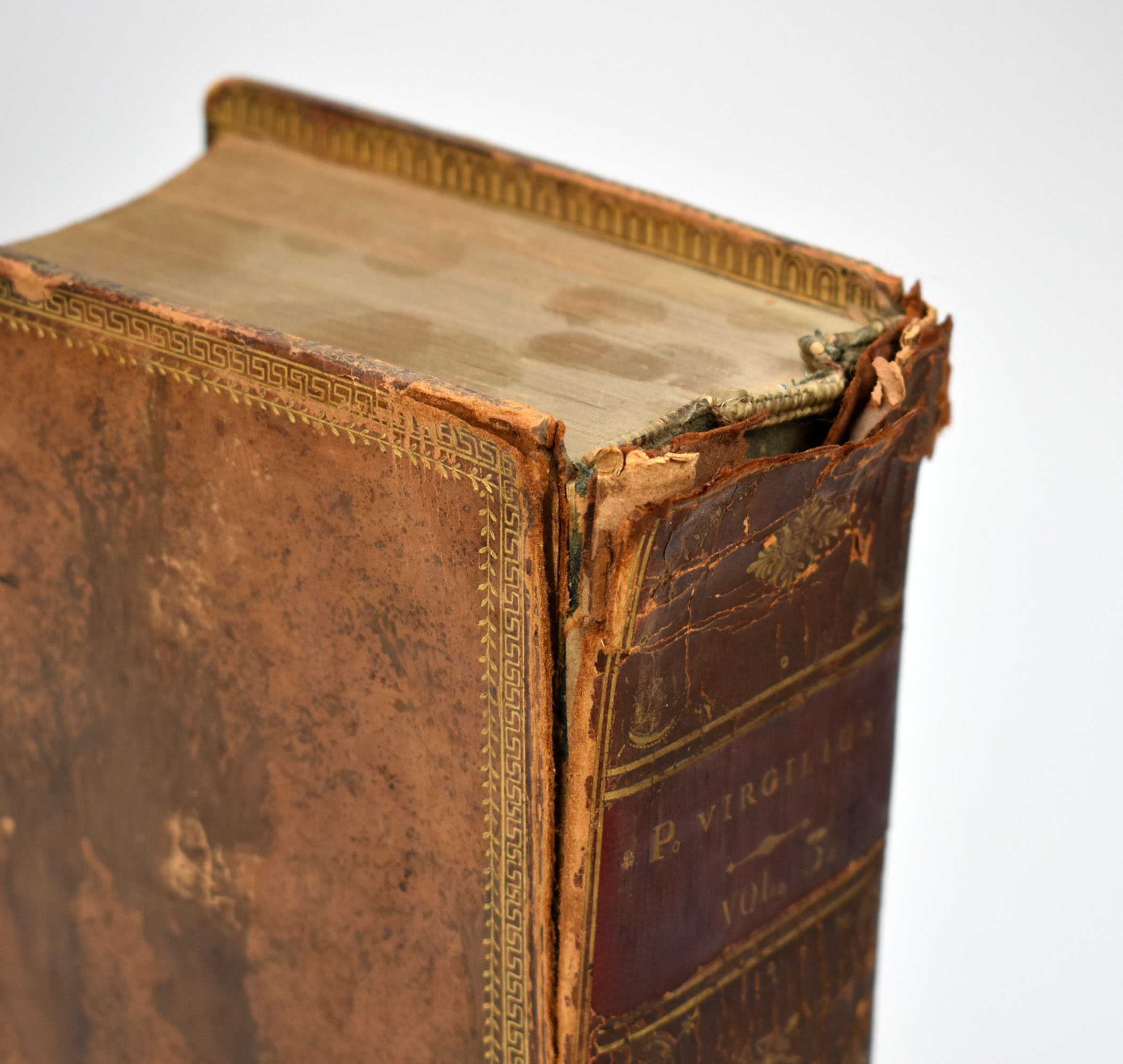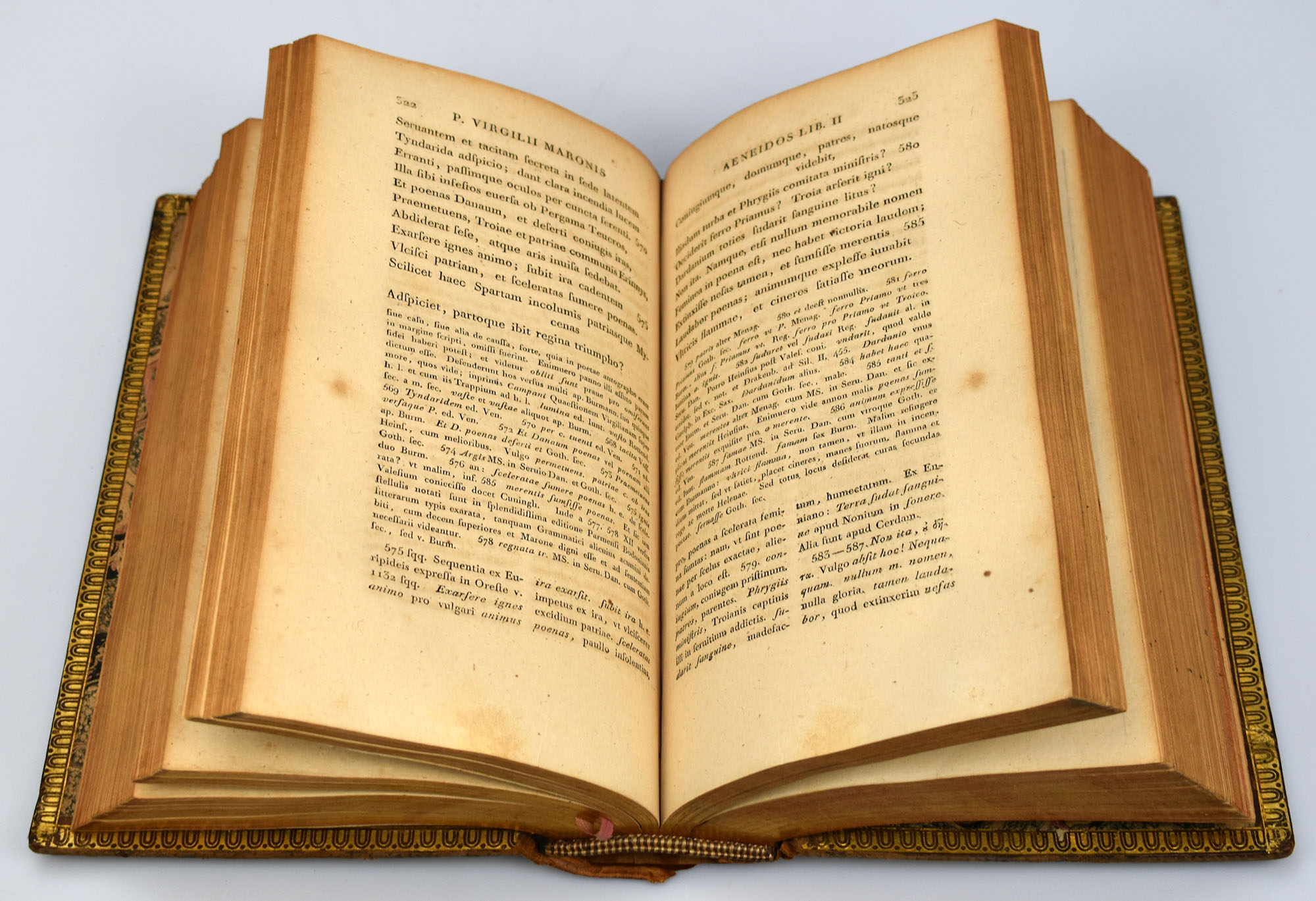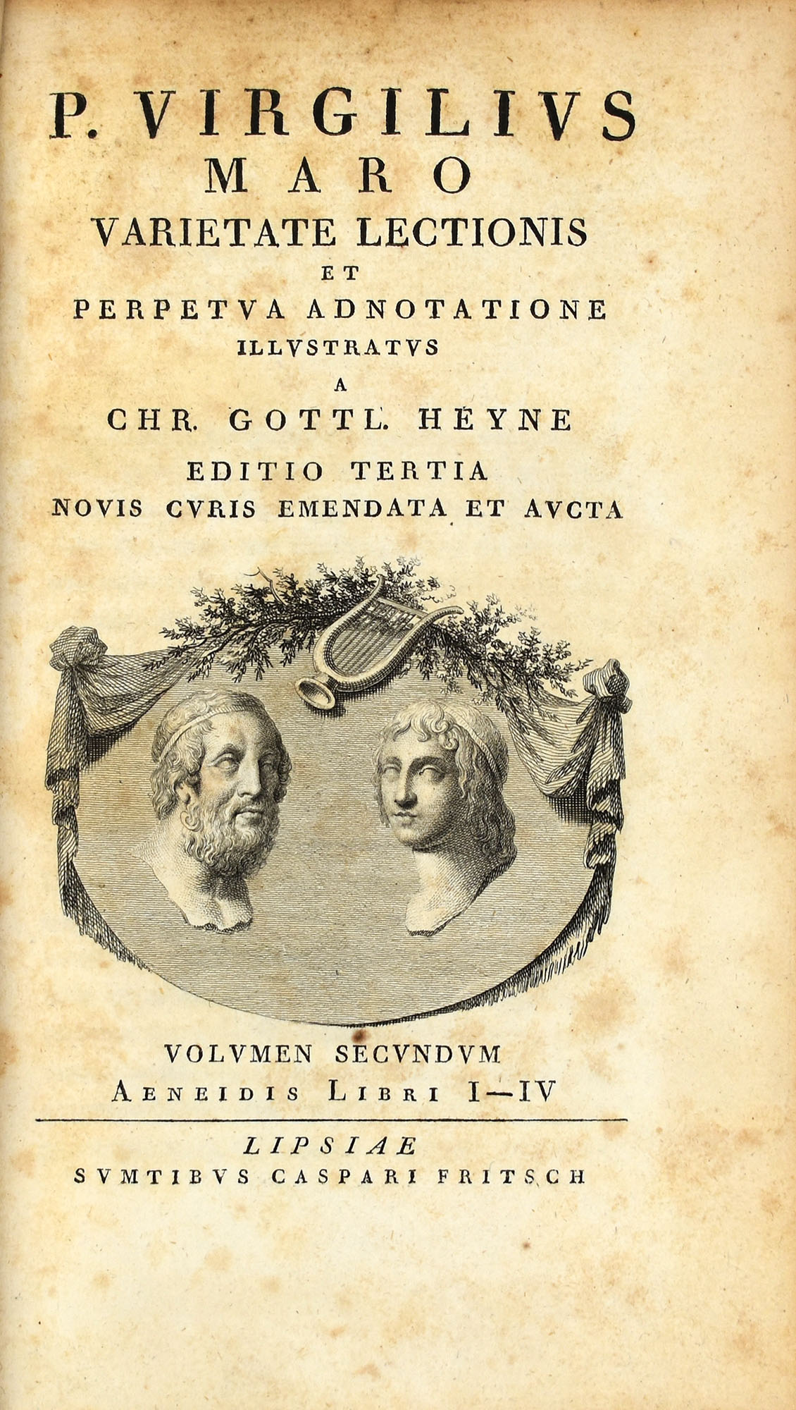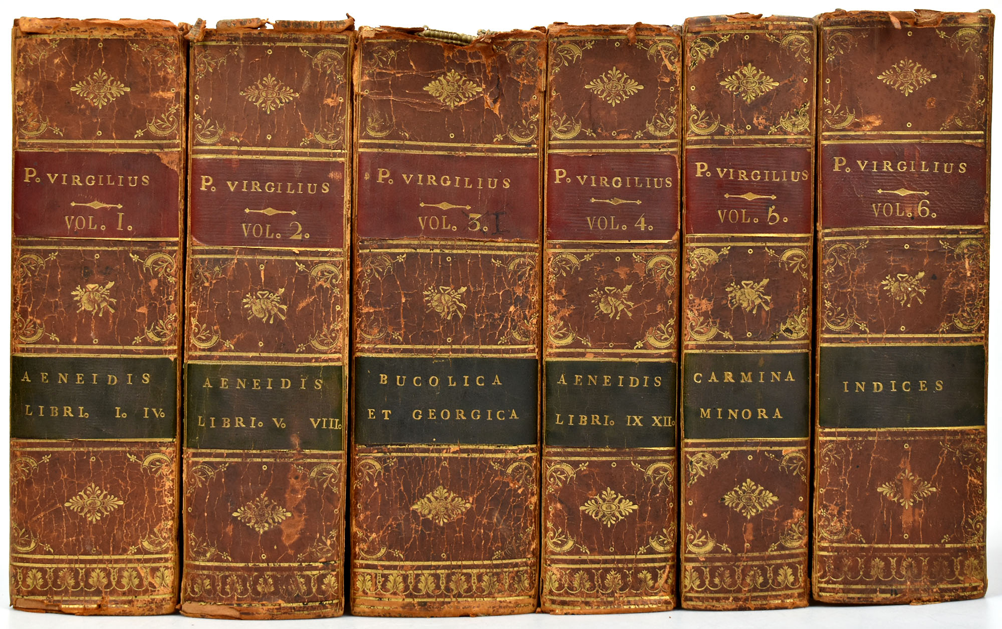 Vergil (Publius Vergilius Maro): P. Virgilius Maro varietate lectionis et perpetua adnotatione illustratus a Chr. Gottl. Heyne. Band 1, 2 und 4: Editio tertia novis curis emendata et aucta. Volumen secundum, tertium, quartum. Aeneidis libri I-XII. Band 3: Accedunt indices editio novis curis emendatat et aucta. Volumen primum. Bucolica et Georgica. Band 5: Editio tertia novis curis emendata et aucta. Volumen quintum. Carmina Minora. Band 6: Editio tertia novis curis emendata et aucta. Volumen sextum. Indices. 6 Bände (komplett) / 6 volumes (complete). Leipzig, Caspar Fritsch/Dürr, 1797-1800. 8°. 22,5 x 14,5 cm. LXXXVIII, 740, 724, LXII, 776, 576, VI, 538 und 798 Seiten. Halblederbände der Zeit mit goldgeprägten Rückentiteln auf roten und grünen Lederschildchen, goldgeprägter Buchschmuck und Innenfileten sowie Rundum-Goldschnitten.