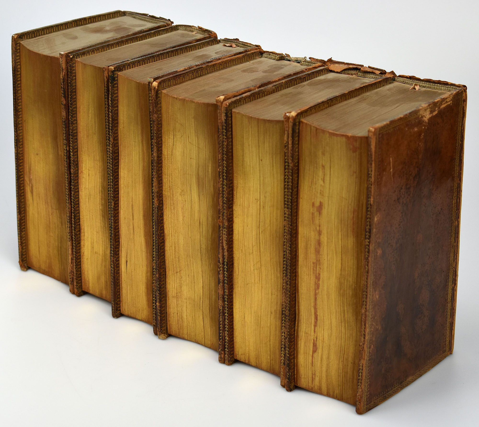 VD18 90484355, VD18 90484347, VD18 90484363, VD18 90484371, VD18 90484398 und VD18 90484401. Ausgabe in Latein. Mit Titelkupfern und zahlreichen Textkupfern. In Band 3 ein zwischengebundenes Frontispiz. Einbände an den Rücken deutlich berieben, Kapitale und Außenfalzen mit Einrissen, Leder teils brüchig, Vorsatz von Band 2 gerissen, Vorderdeckel und Rücken des Einbands lose. Fliegende Blätter verso teils mit winzigem Namensaufkleber „Gueffier“ und winzigem Zifferneintrag. Blätter teils braunfleckig. Gute Exemplare. Latin language edition. With copper etchings at the title pages and in the text. With one frontispiece in volume 3. Half leather bindings with gilt embossed ornaments and titles on leather labels on the spines, and gilt edges. Covers significantly rubbed at the spines, leather brittle, with tears at the ops and bottoms, and at the outer folds, endpaper of volume 2 teared, front cover and spine part of the cover binding loose. Endpapers verso partly with a tiny sticker „Gueffier“ and a tiny number inscription. Sheets partly spotted. Good copies.