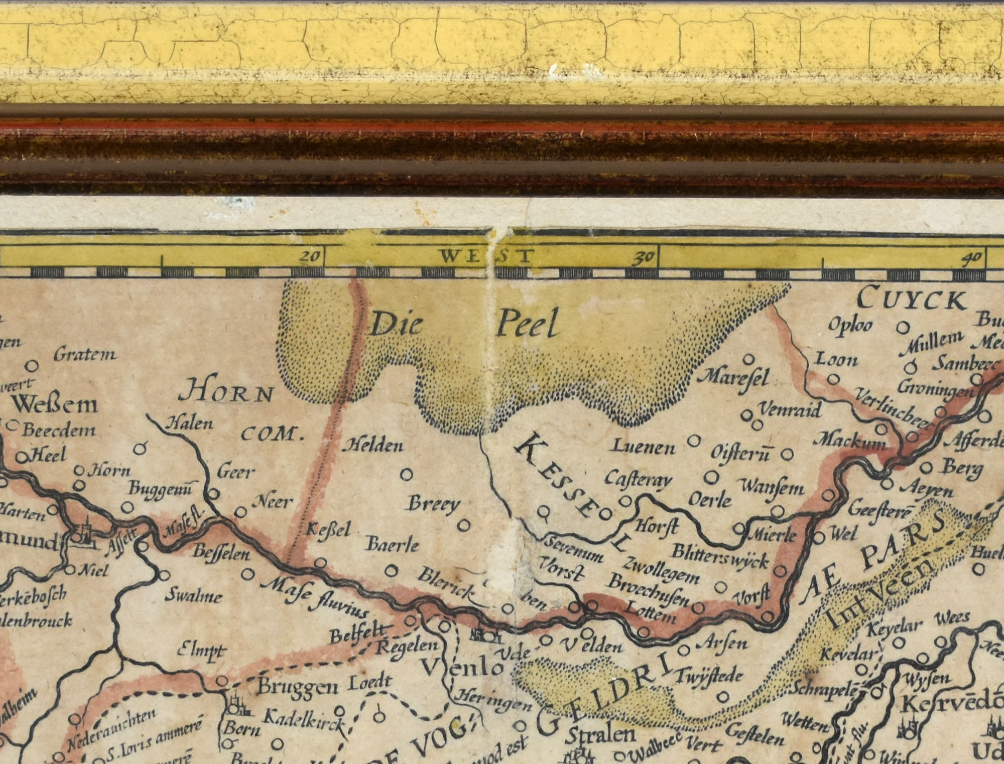 Mit den Gebieten des Niederrheins um Jülich und Kleve. In den oberen Ecken mit Porträt des Kaisers Rudolf II. und des Markgrafen Ernst zu Brandenburg. Untere rechte Ecke mit kleiner Karte der Grafschaft Ravensberg und Lippe. Mit Titelkartusche mit Wappen und Meilenzeiger. Hinter Glas im Holzrahmen gerahmt, rückseitig mit einem Haken zur Aufhängung. Nicht ausgerahmt. Maße Rahmen: 50,7 x 62,2 cm. Maße Abbildung: ca. 42,5 x 55,2 cm. Karte offenbar mittig mit schwachem Falz, Papier dort geringfügig ausgedünnt, im oberen Bereich mit kleineren Fehlstellen. Blatt teils etwas gebräunt, braunfleckig, vereinzelte kleine Fleckchen. Unterer linker Blattrand im Weißraum mit kleiner Fehlstelle. Insgesamt sehr guter Zustand.