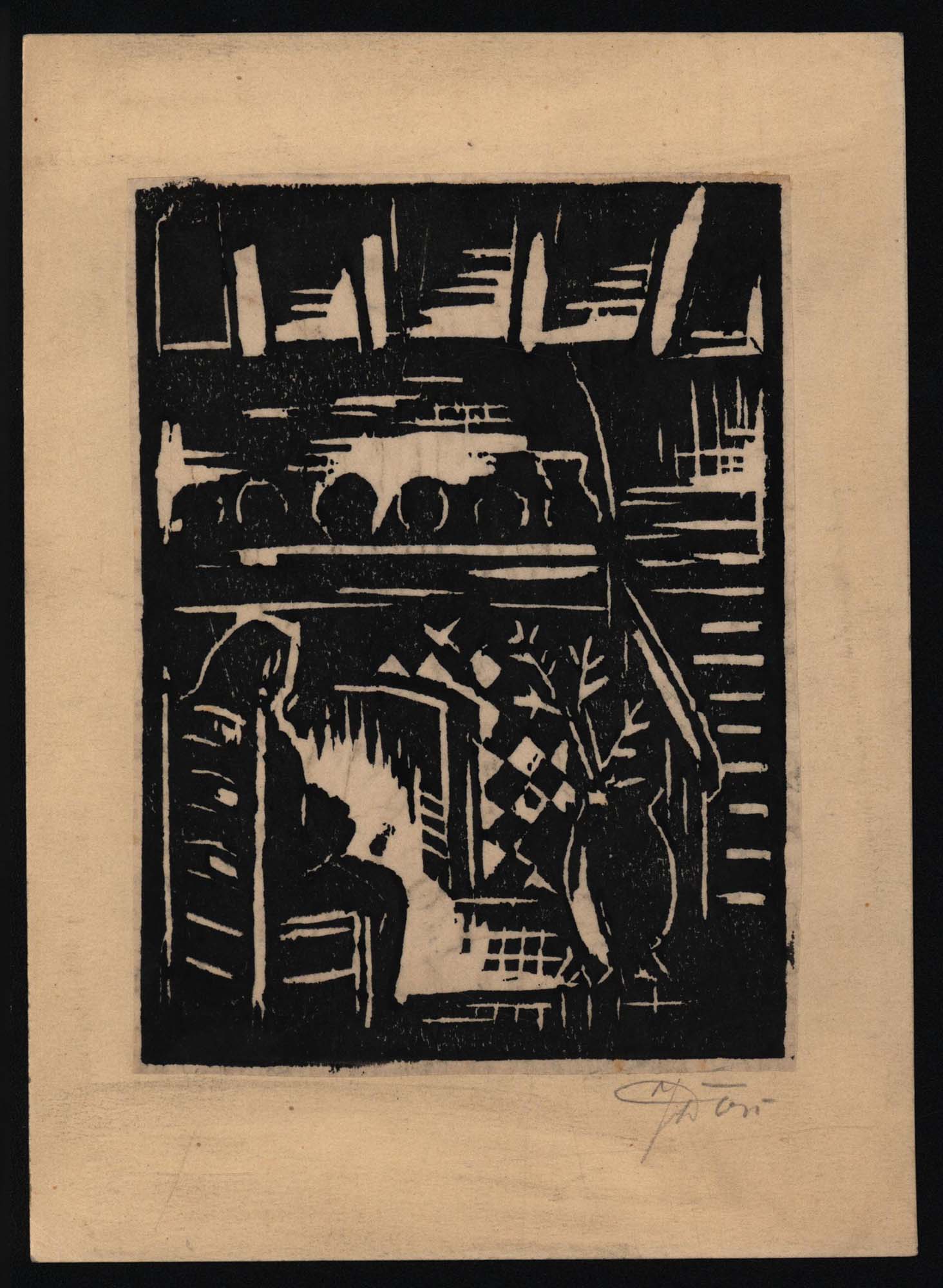 Dors, Jupp: Am Kamin. [Signierter Original-Holzschnitt mit Widmung]. (Jupp Dors, geb. 1894, gest. 1963, niederrheinischer Künstler).