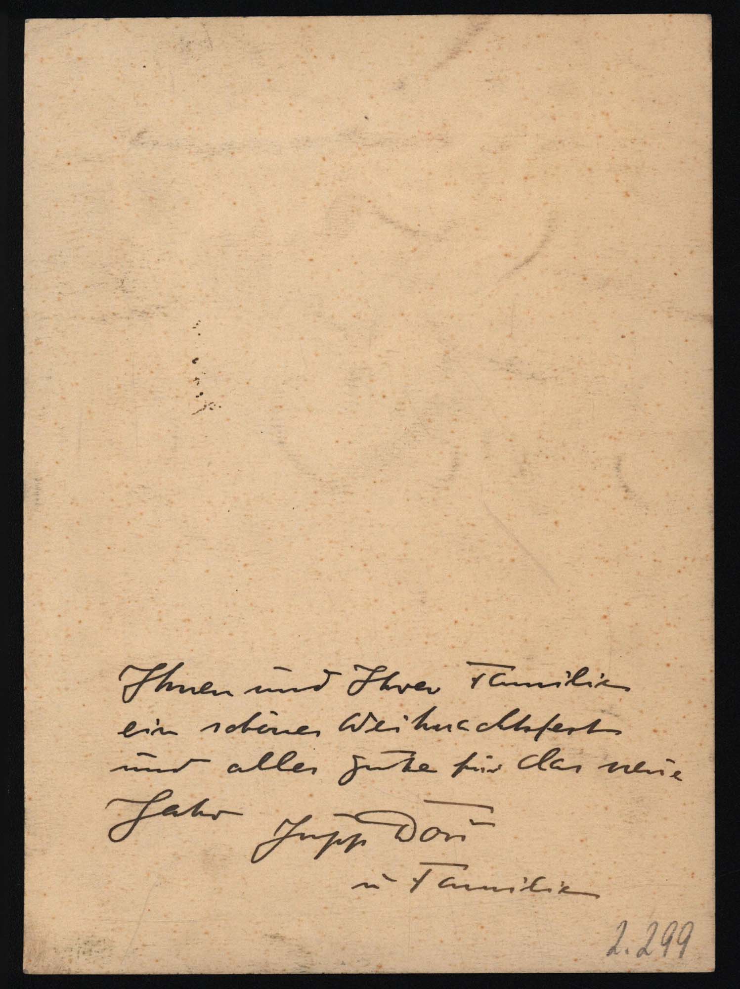 Original-Holzschnitt von Jupp Dors, an den oberen beiden Ecken auf Trägerpapier montiert, unterhalb der Abbildung mit Bleistift signiert, rückseitig mit einem handschriftlichen Weihnachtsgruß von Jupp Dors in Tinte und mit kleiner zugesetzter Inventarnummer von Ralf Seilheimer. Provenienz: Aus dem Nachlass des Kunstsammlers und Autors Ralf Seilheimer. Maße Abbildung: 14,8 x 11,0 cm. Maße Trägerpapier: 20,7 x 15,0 cm. Trägerpapier rückseitig leicht fleckig. Insgesamt sehr guter Zustand.