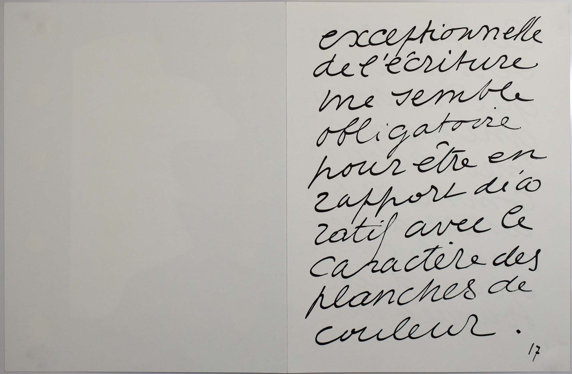 Colour lithograph on paper, based on the paper cut for „Jazz“ by Henri Matisse: „Monsieur Loyal“. Sheet from the 2004 facsimile edition published by Arcueil Cedex, Edition Anthese, after the original of 1947, with one vertical fold in the middle and handwriting in facsimile on the opposite page. Dimensions sheet/illustration: 39.0 x 60.0 cm. Fine condition.