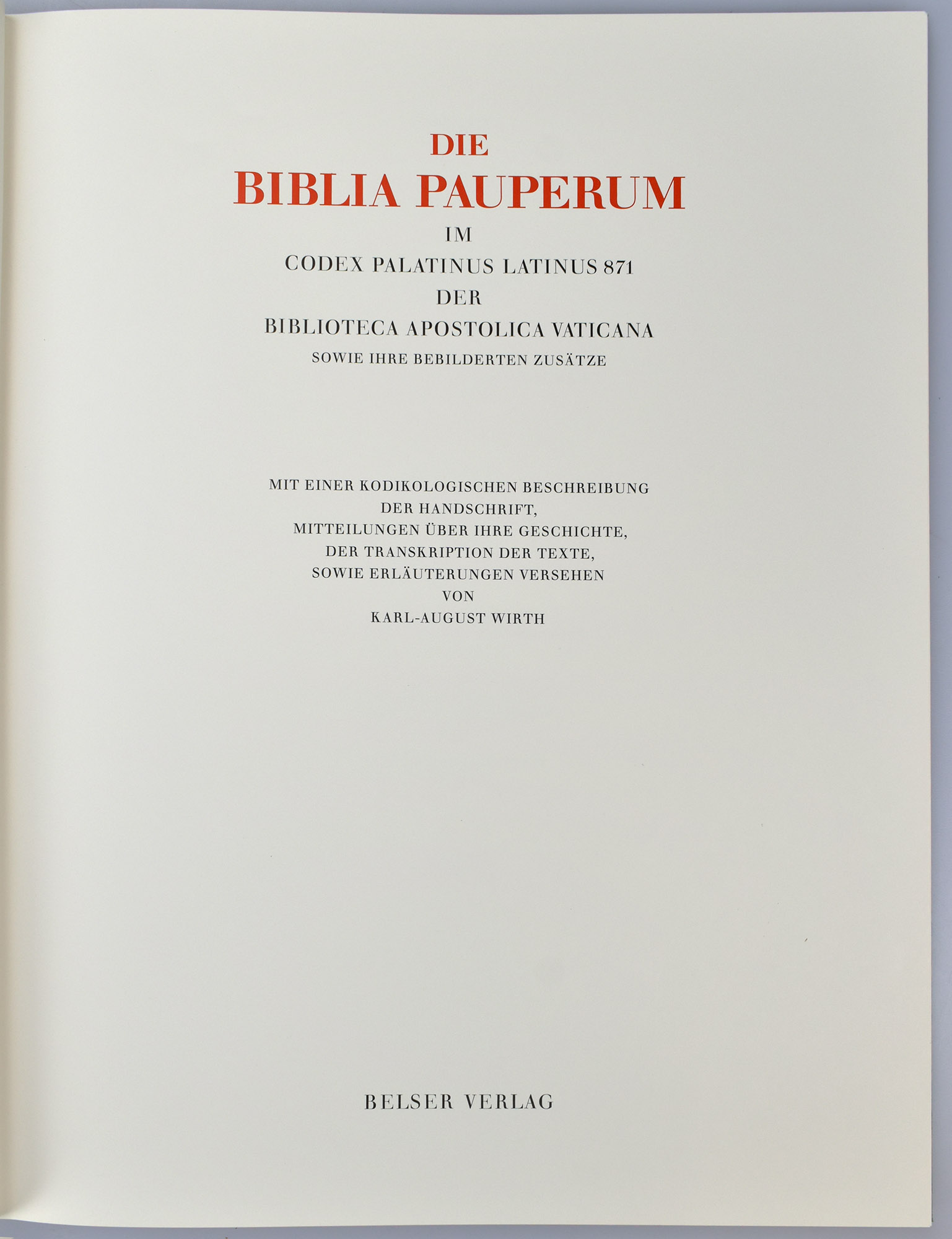 Wirth, Karl-August (Bearb.): Die Biblia pauperum im Codex Palatinus Latinus 871 der Biblioteca Apostolica Vaticana sowie ihre bebilderten Zusätze. Mit einer kodikologischen Beschreibung der Handschrift, Mitteilungen über ihre Geschichte, der Transkription der Texte, sowie Erläuterungen. 2 Bände [Faksimile und Begleitband; komplett]. Zürich, Belser Verlag, 1982. 2°. 37 x 28,5 cm. [24] Blatt; 106 Seiten. Original-Halblederband und Original-Pappband im Original-Pappschuber. (= Codices e Vaticanis selecti, Band 51).